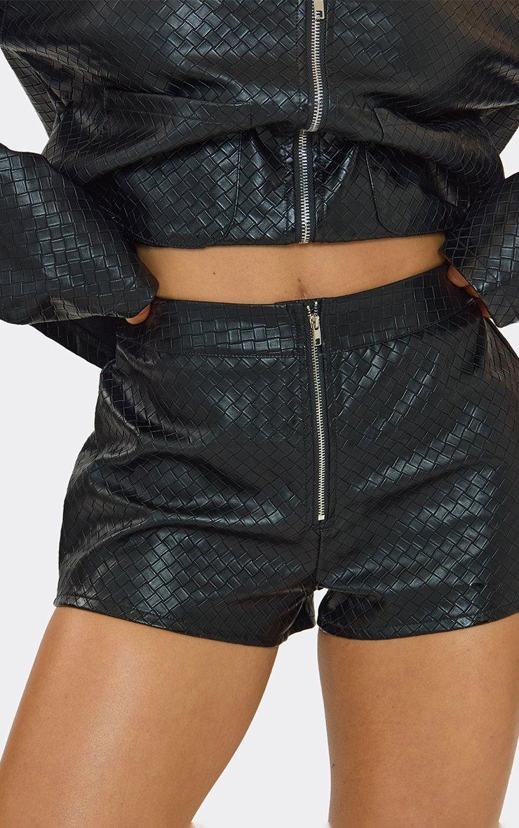 mid rise zip front detail shorts in black textured faux leather