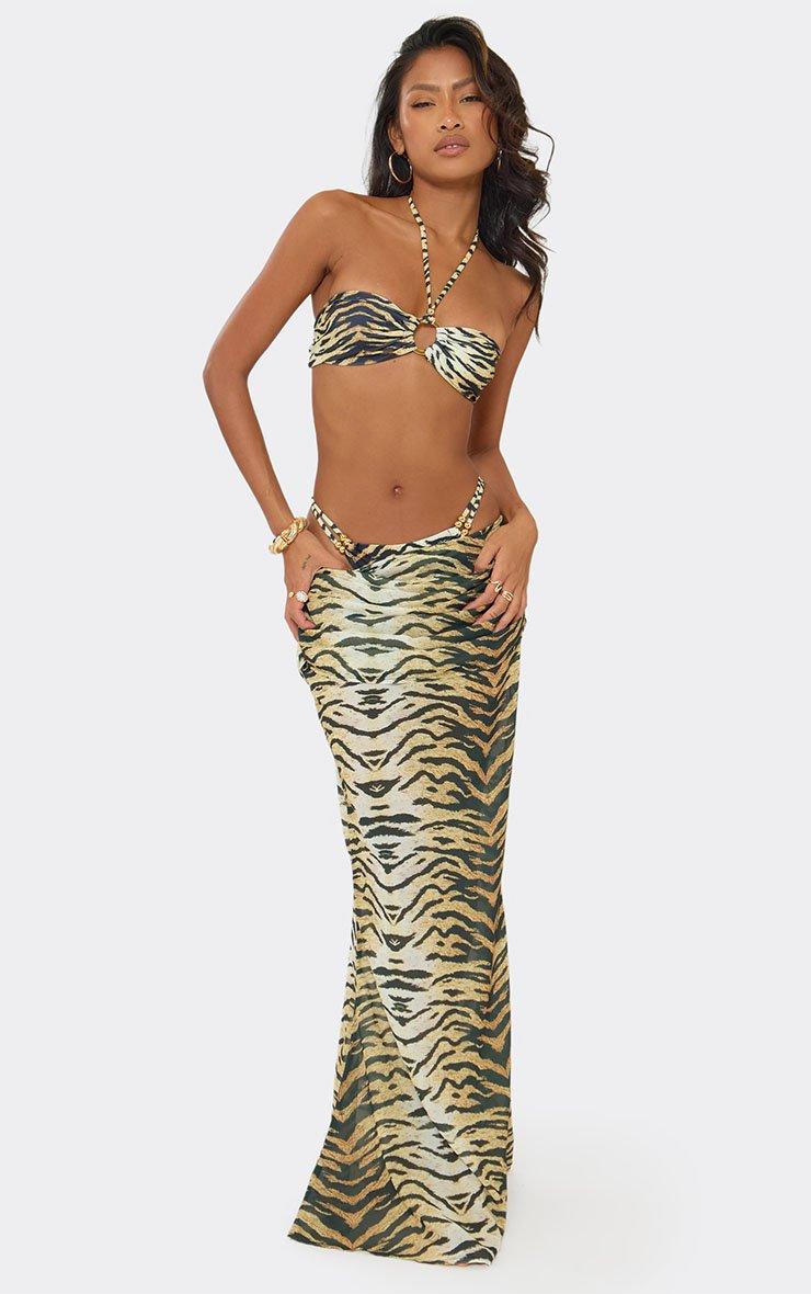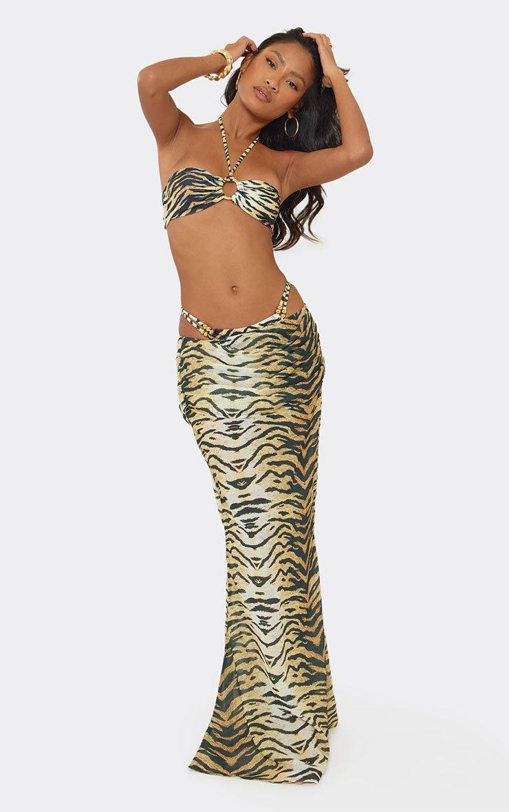 Low Waist Draped Detail Maxi Beach Skirt In Multi Tiger Print