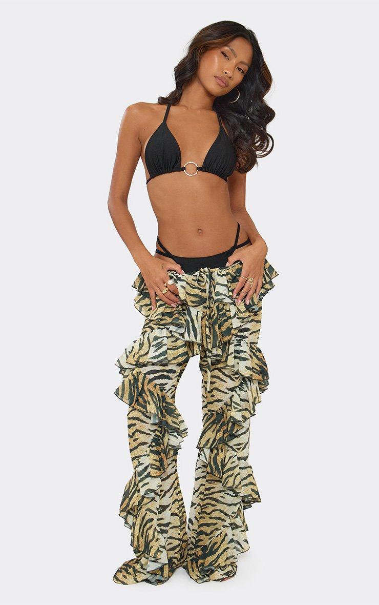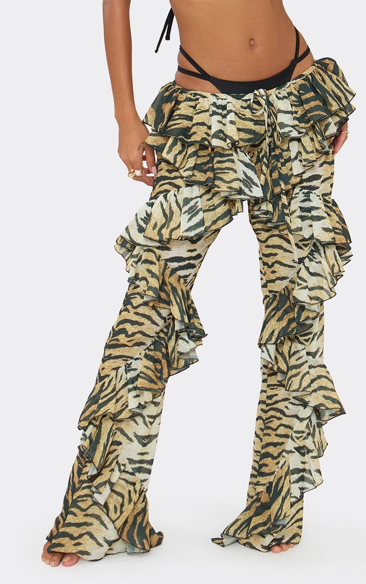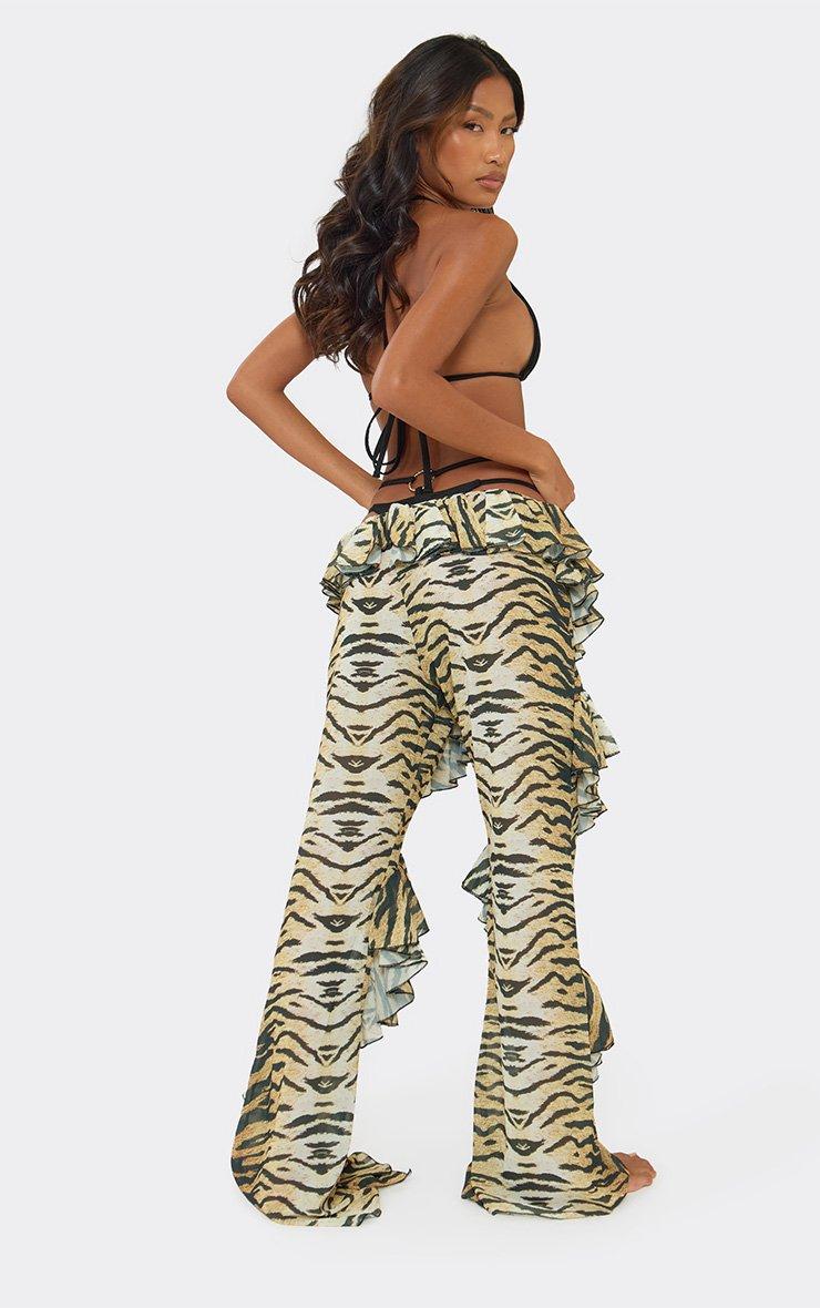 Tie Waist Frilled Detail Trousers In Multi Tiger Print