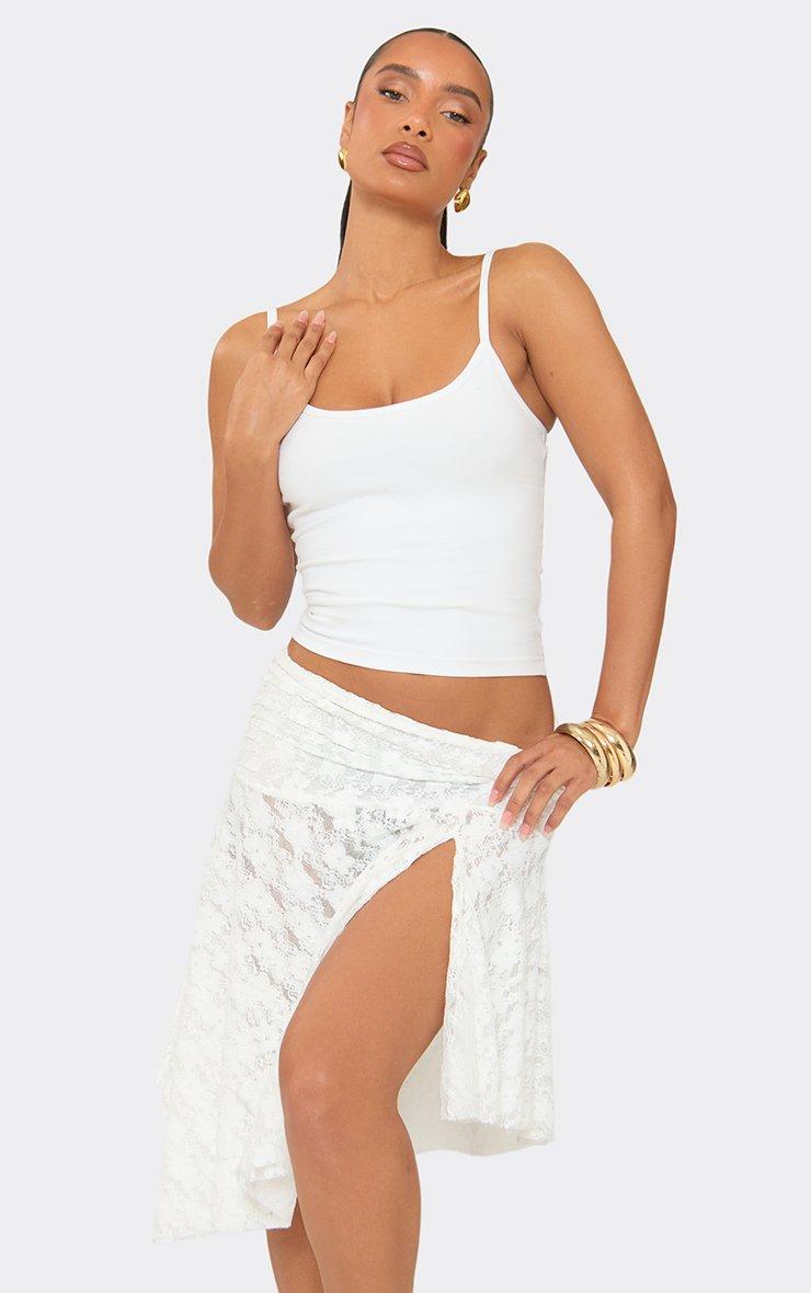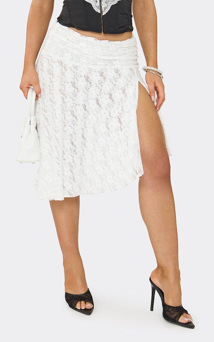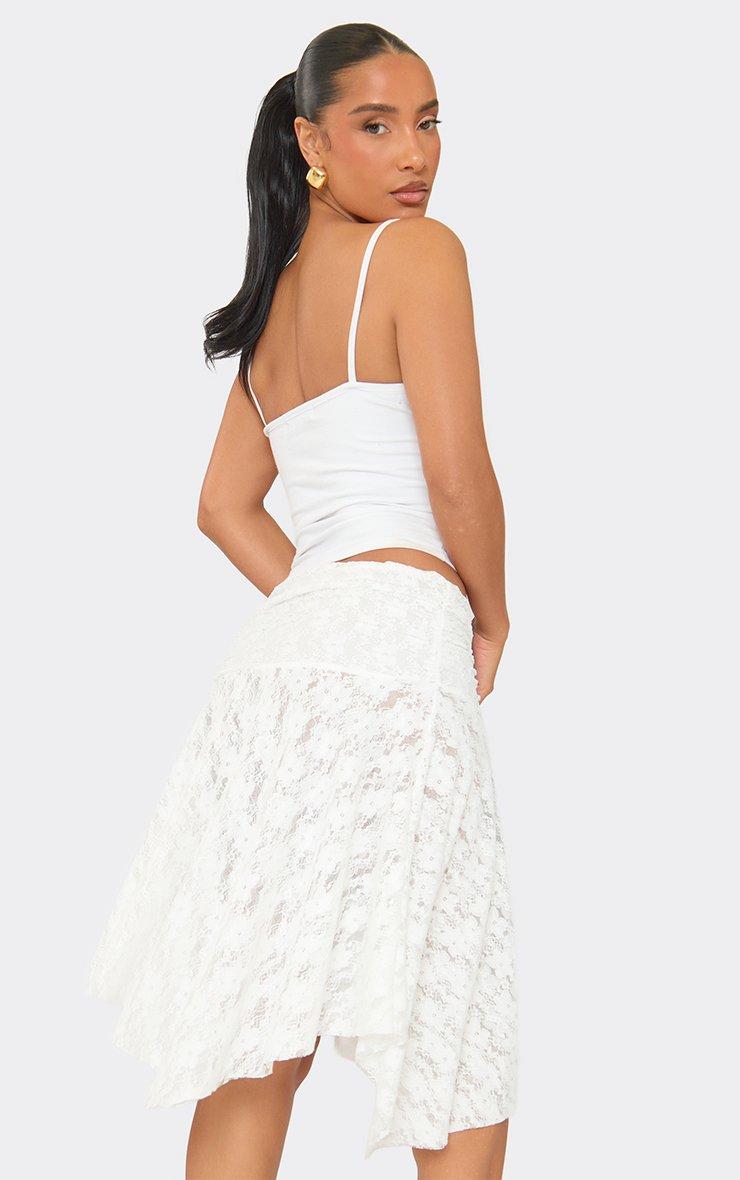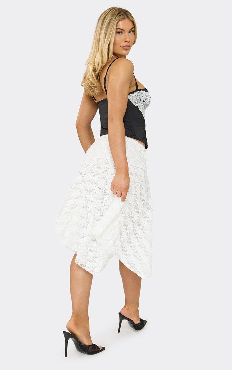 Ruched Waist Asymmetric Hem Midi Skirt In White Lace