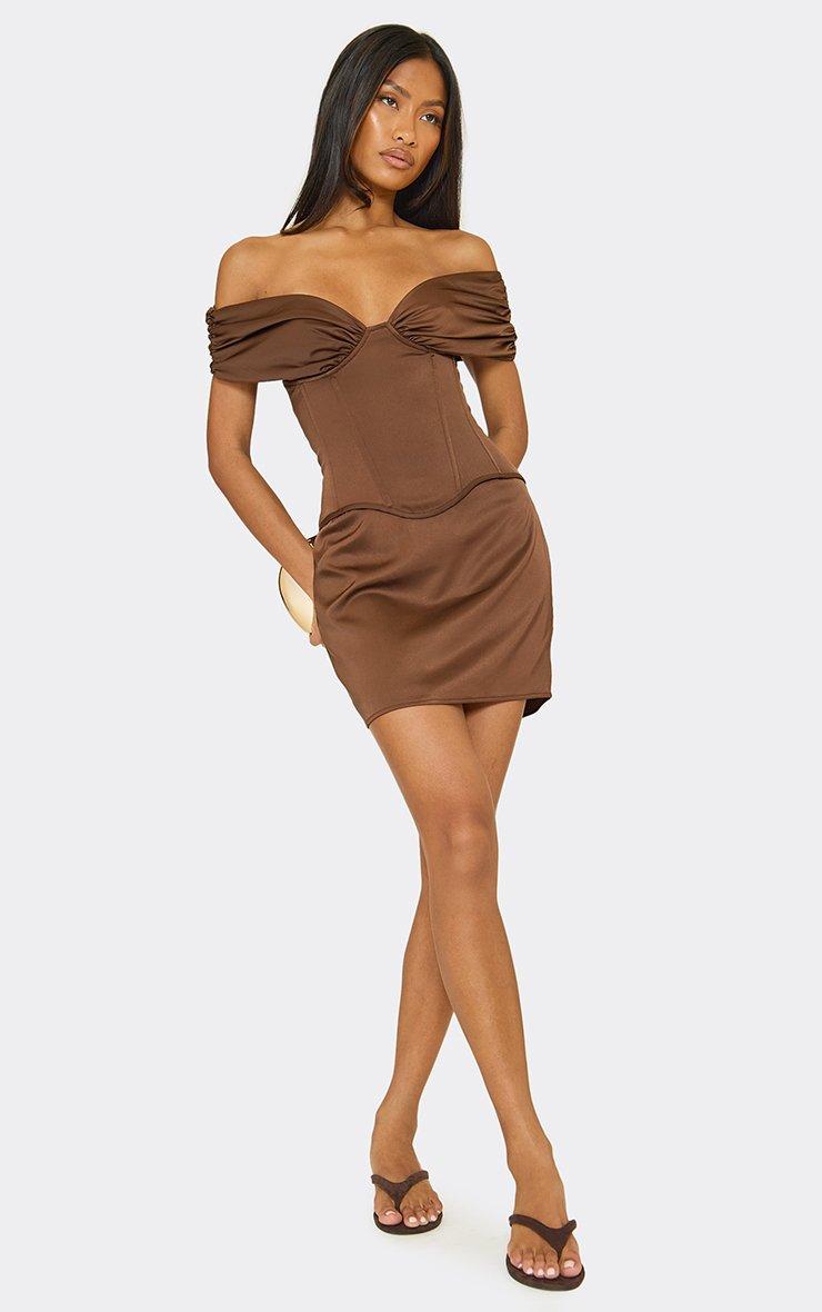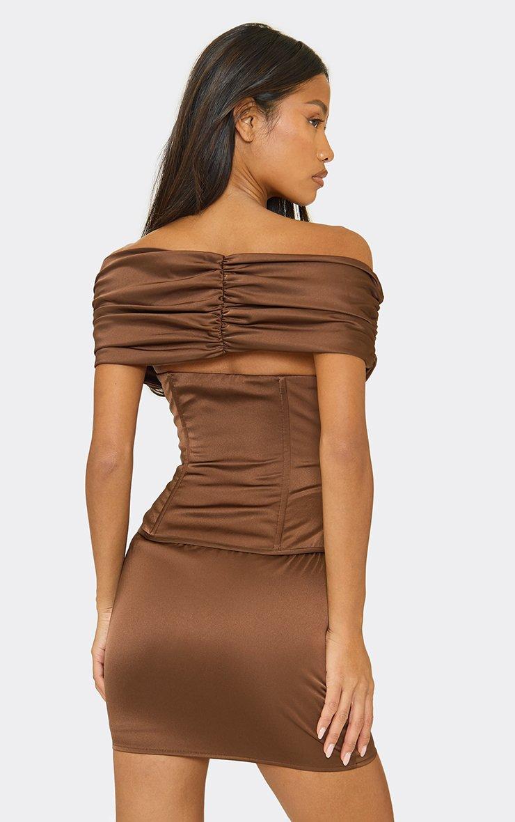 Off The Shoulder Curved Hem Corset Detail Mini Dress In Chocolate Brown Satin