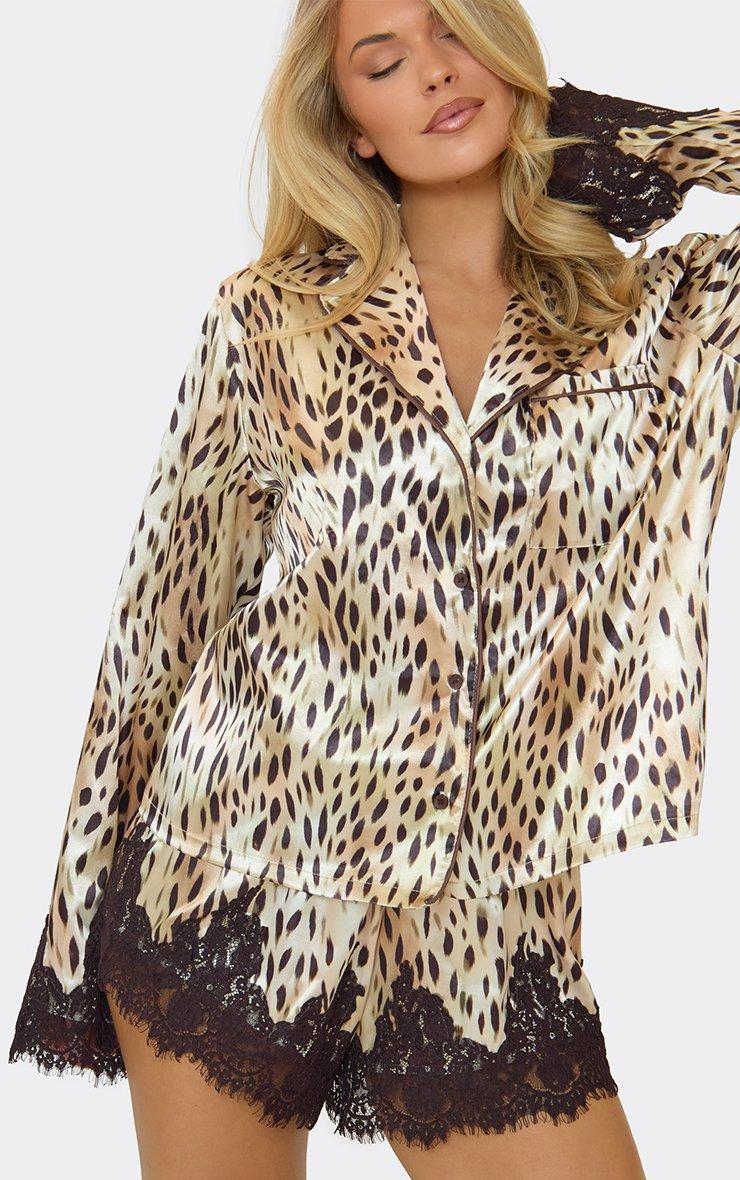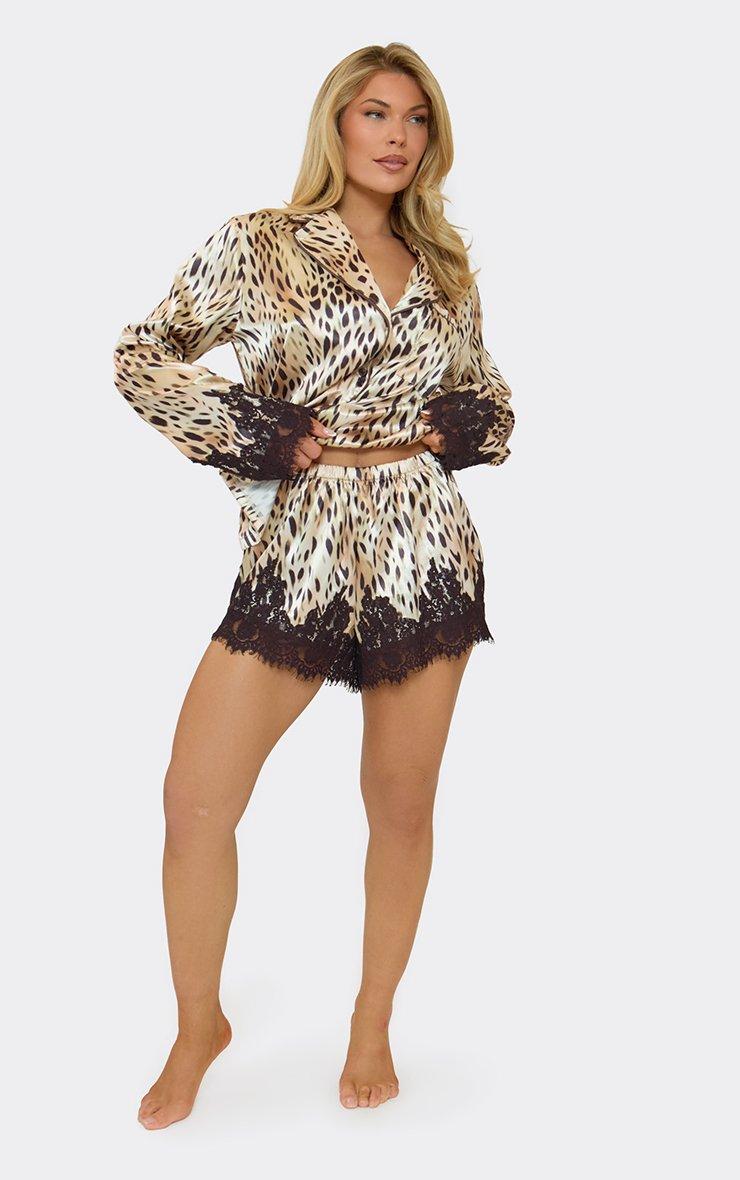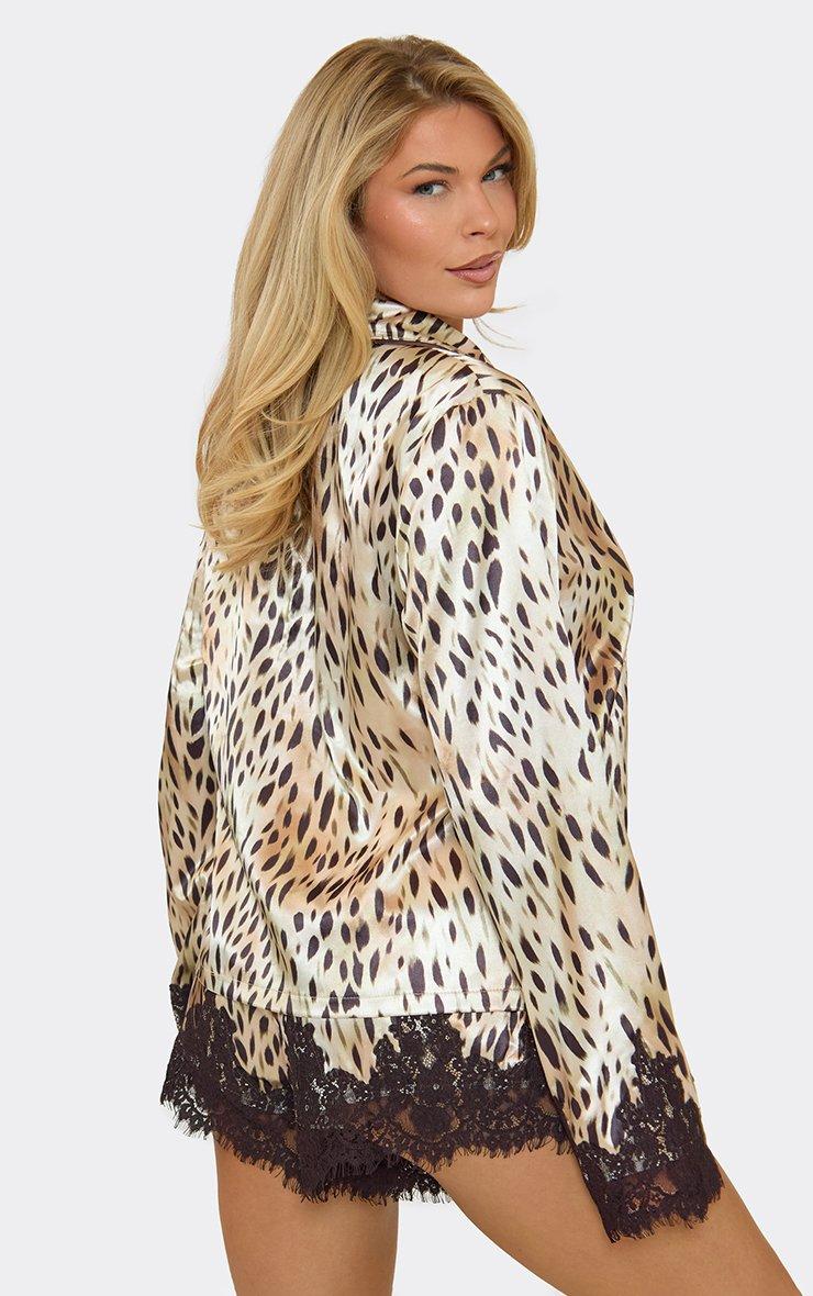 Button Front Lace Trim Shirt And Short Set In Multi Cheetah Print Satin