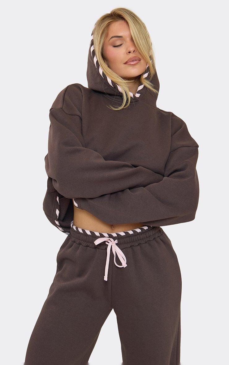 Contrast Lace Up Oversized Boxy Hoodie In Chocolate Brown