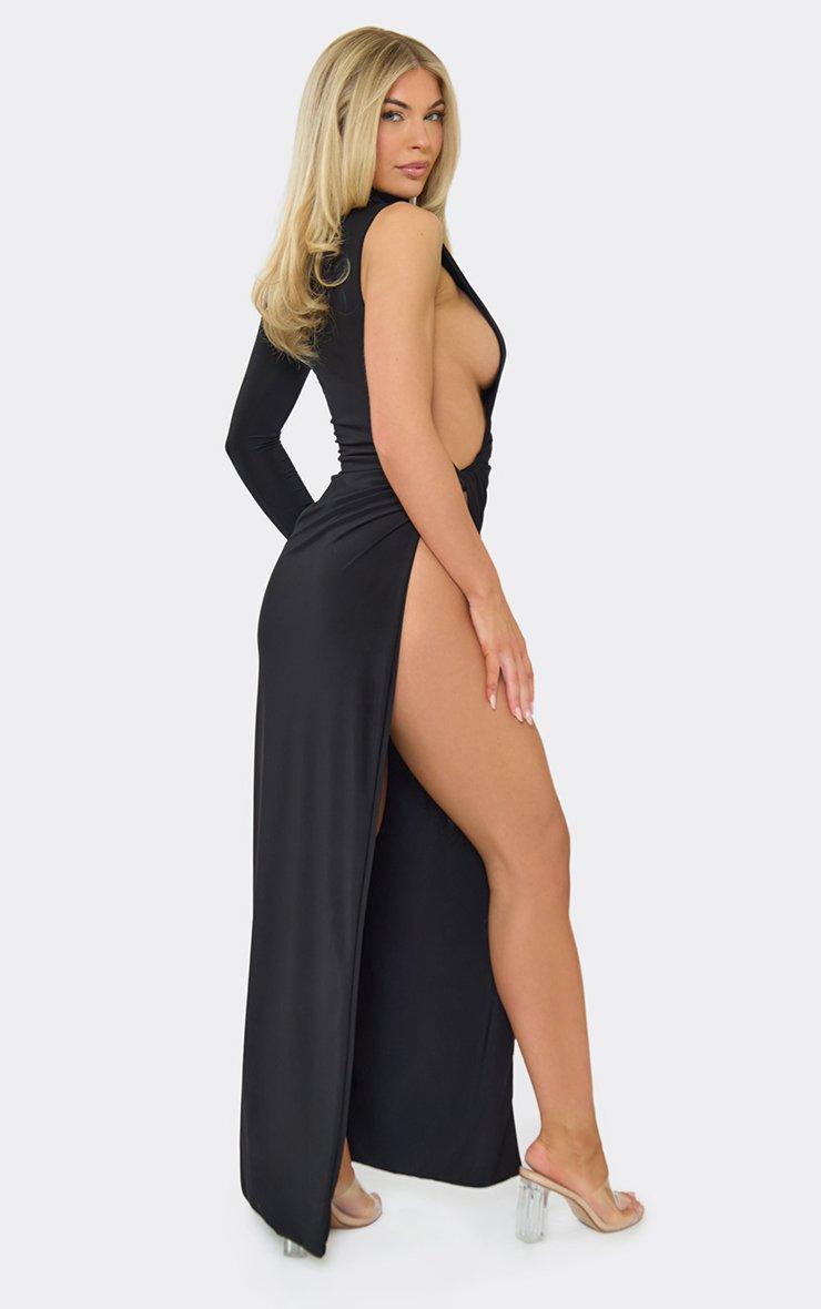 high neck one shoulder extreme side split detail maxi dress in black