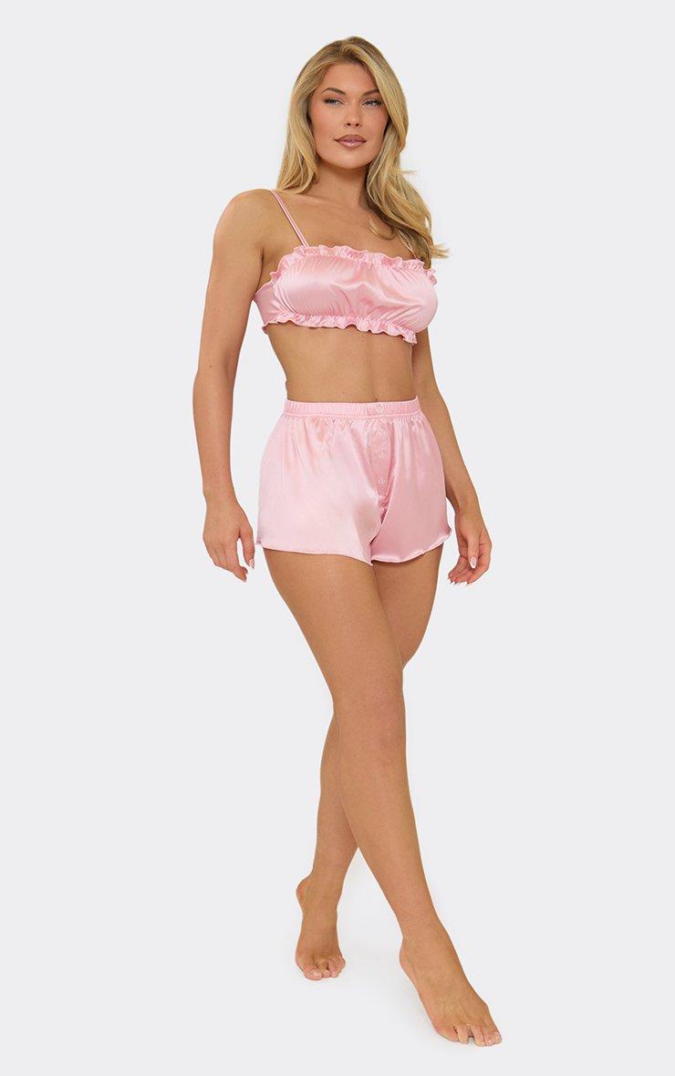 Strappy Shirred Bralet Top And Short Pyjama Set In Pink Satin