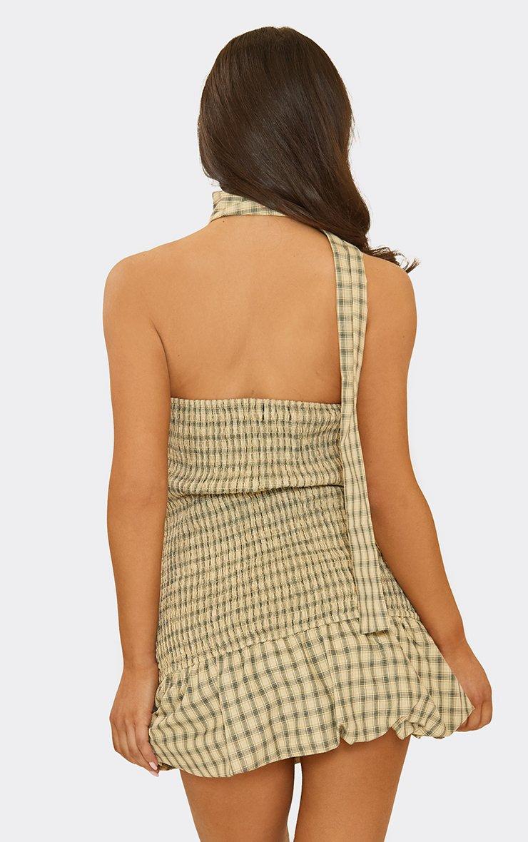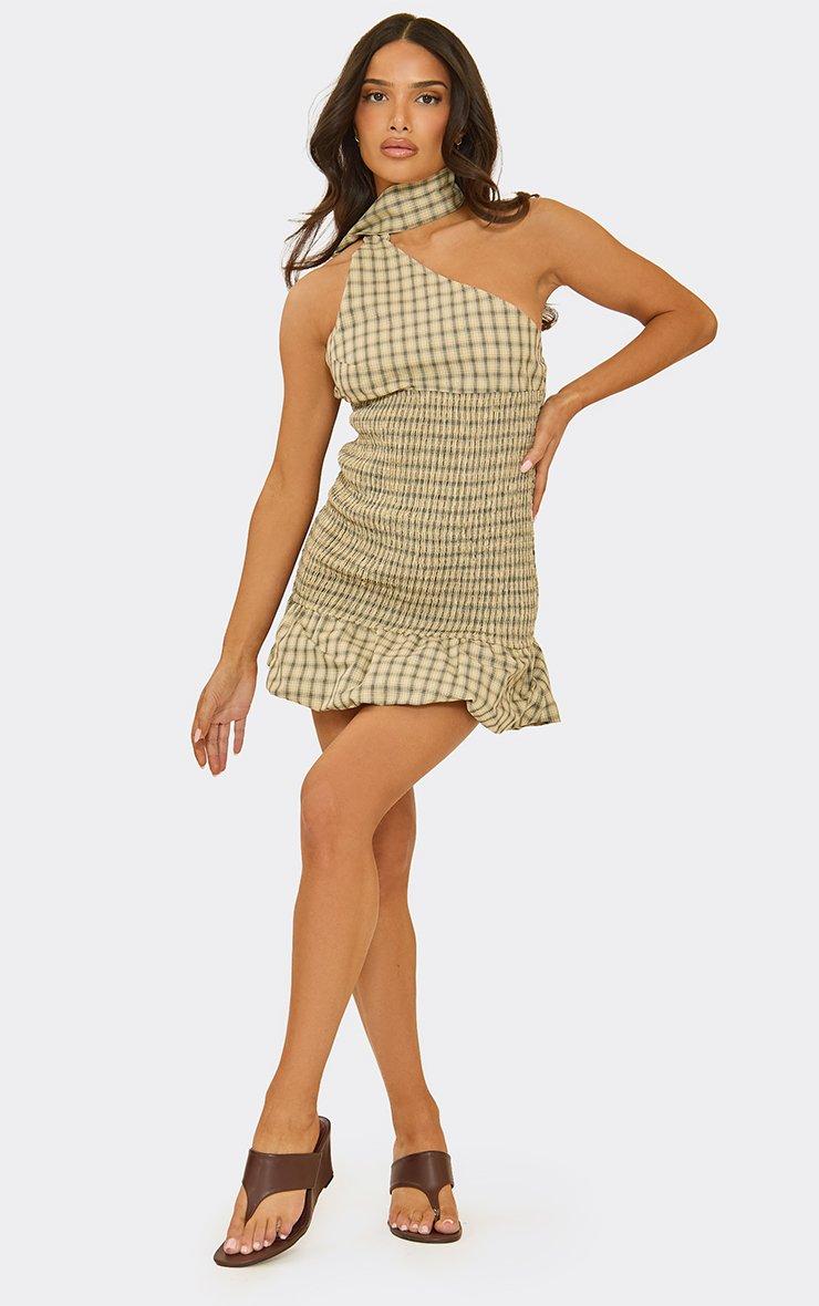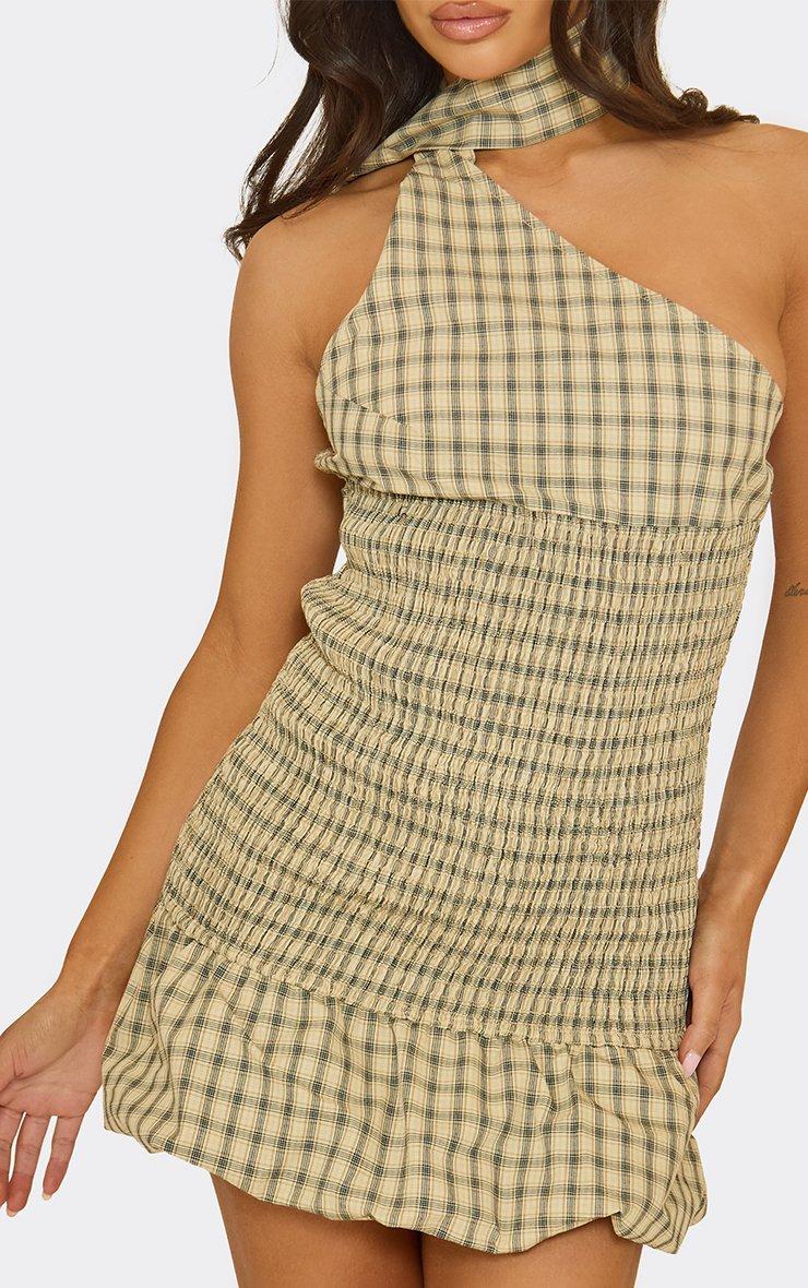 choker scarf detail shirred waist puffball mini dress in cream check print