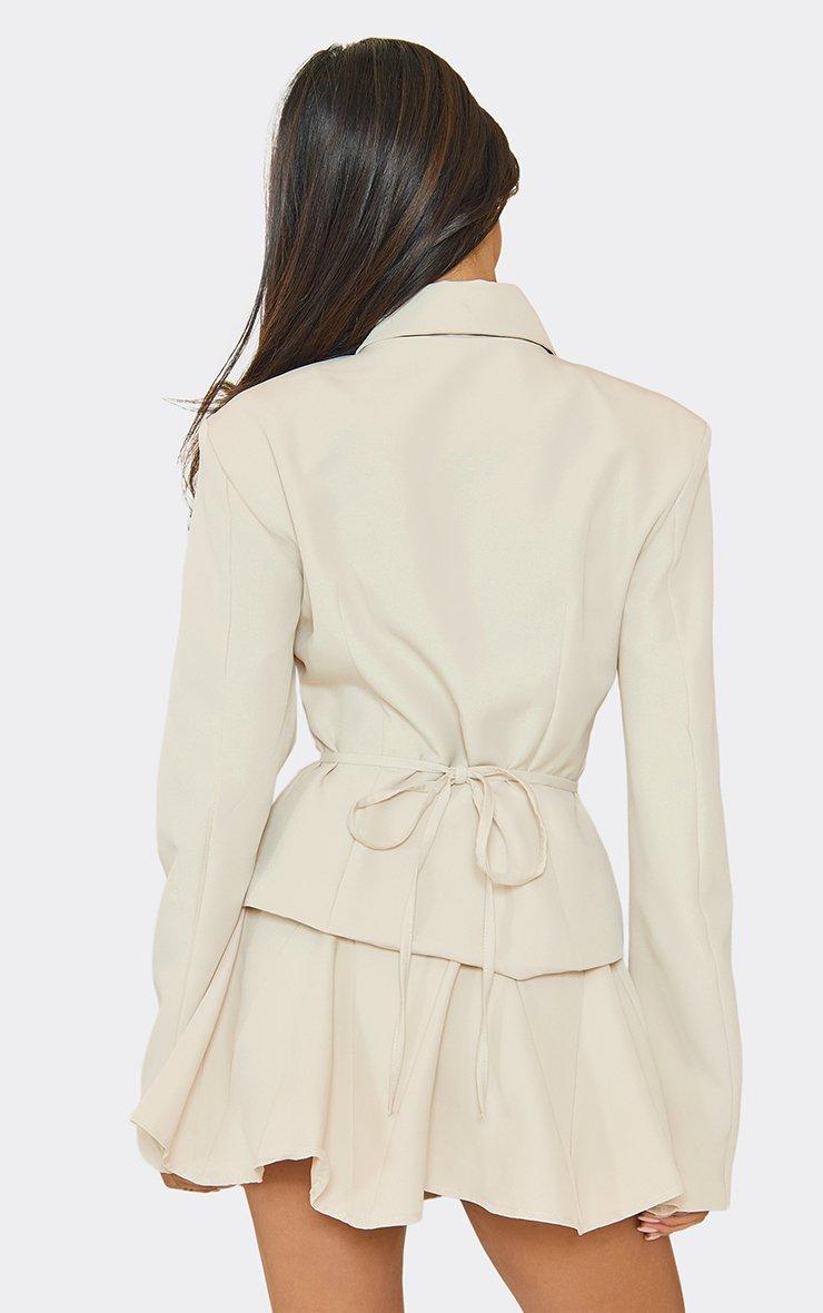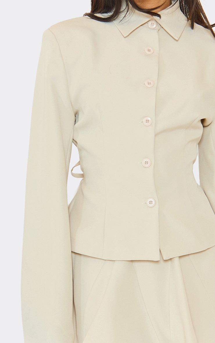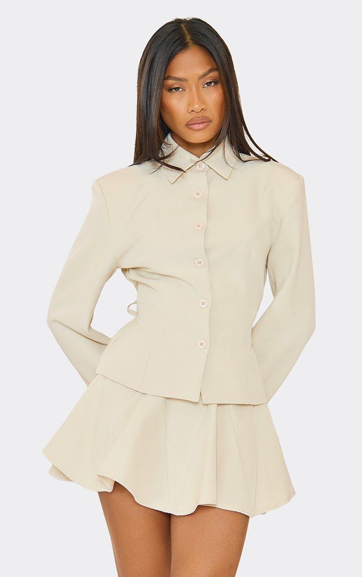 long sleeve button up cinched waist tailored top in stone