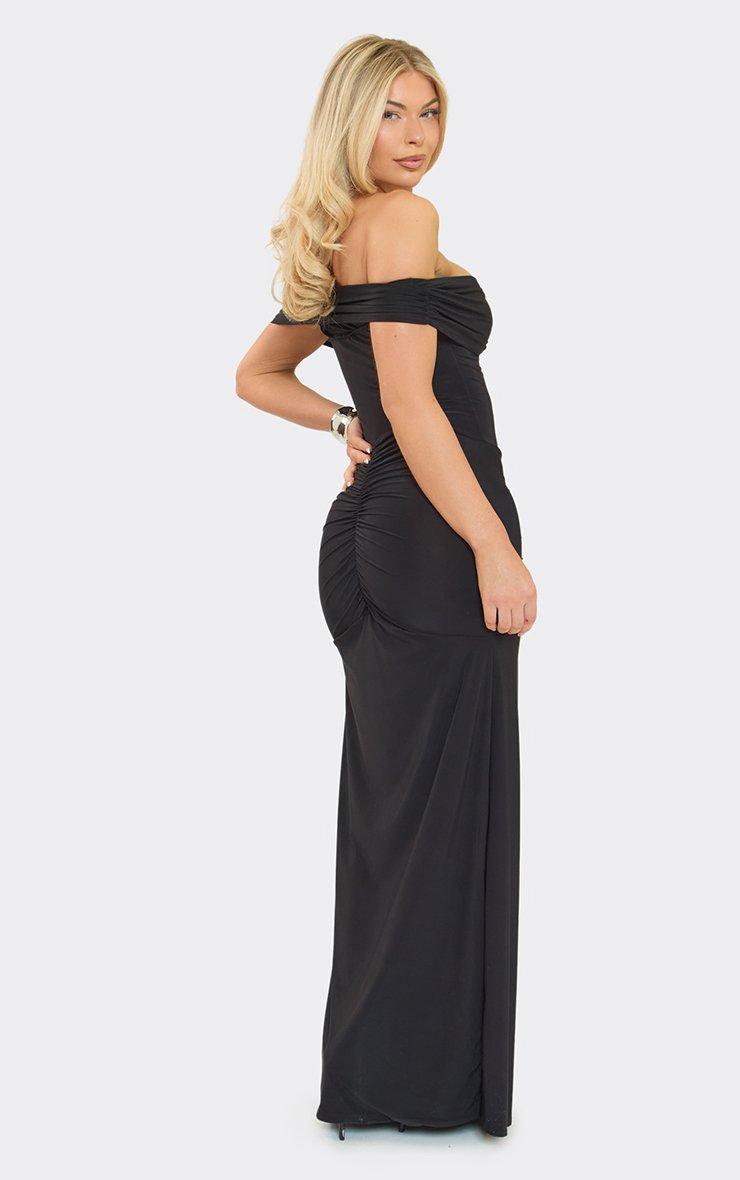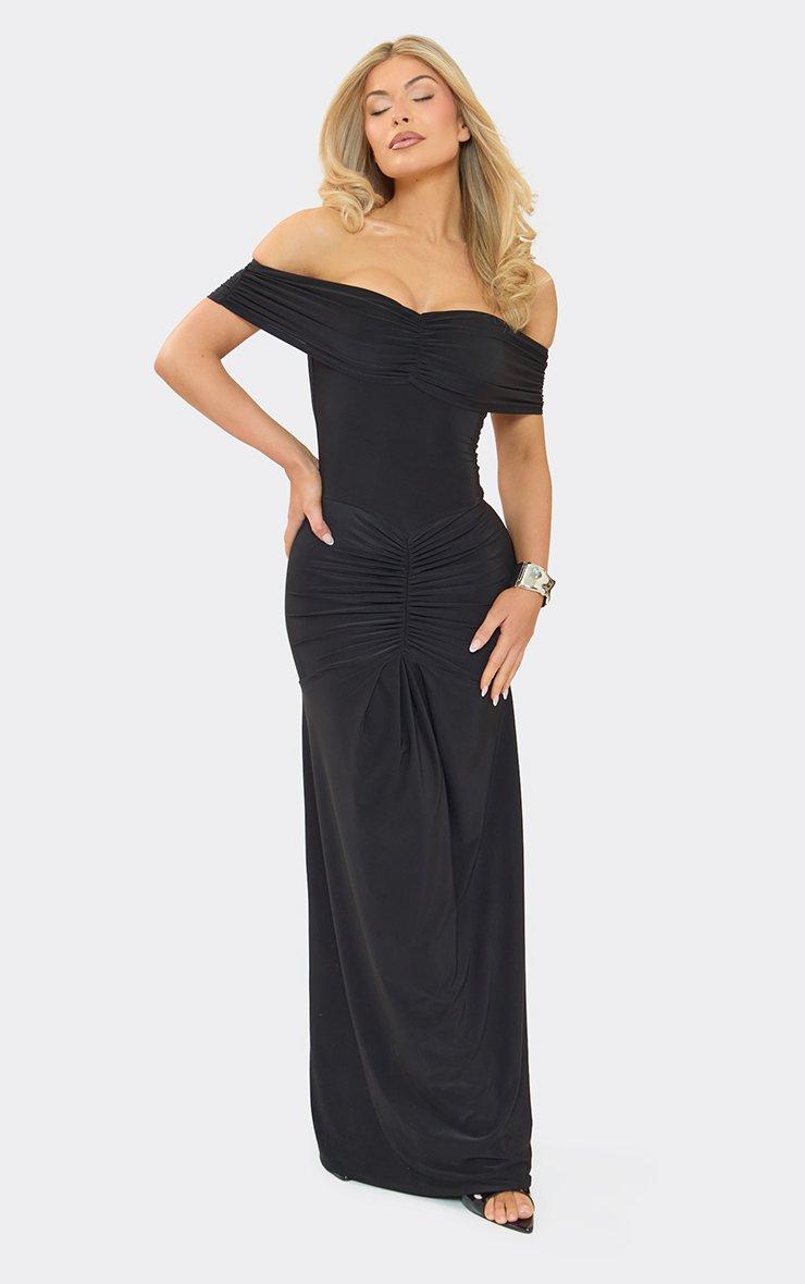 bardot slinky ruched detail maxi dress in black