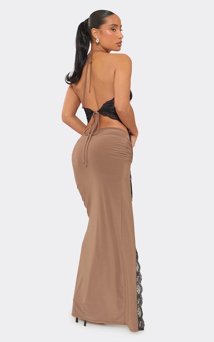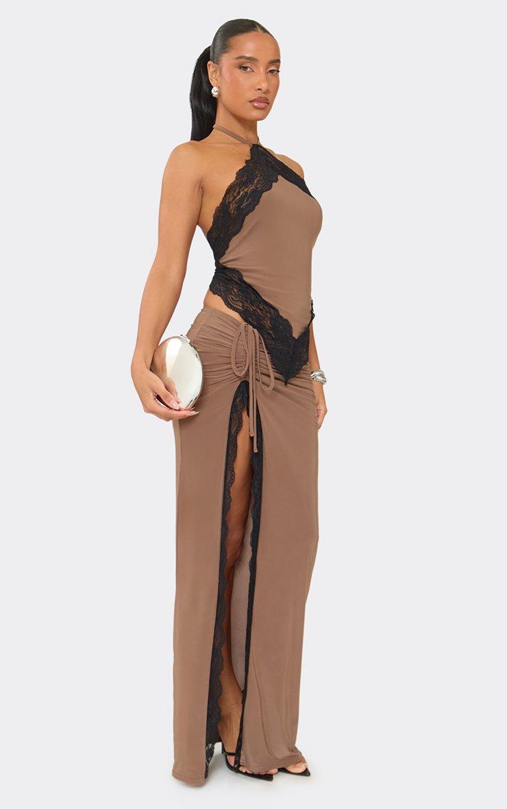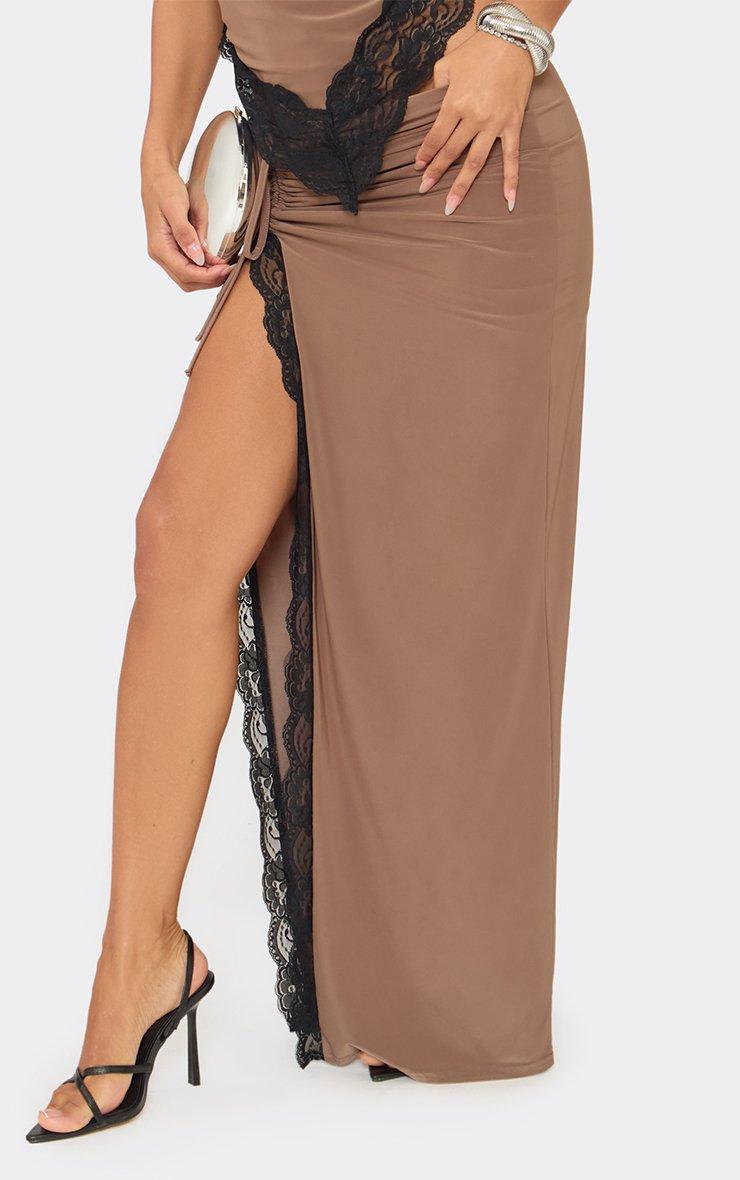 Ruched Side Split Leg Lace Trim Detail Maxi Skirt In Brown