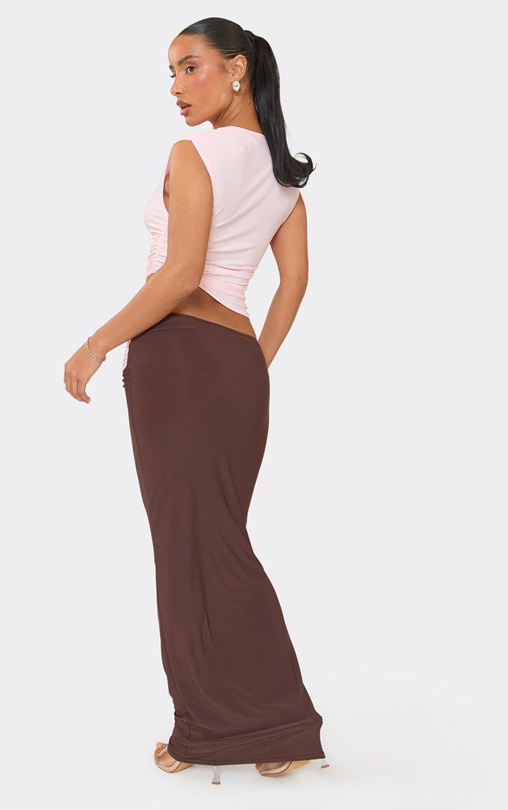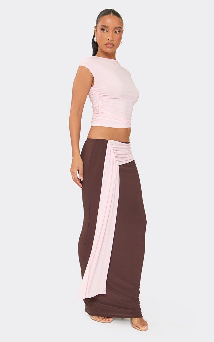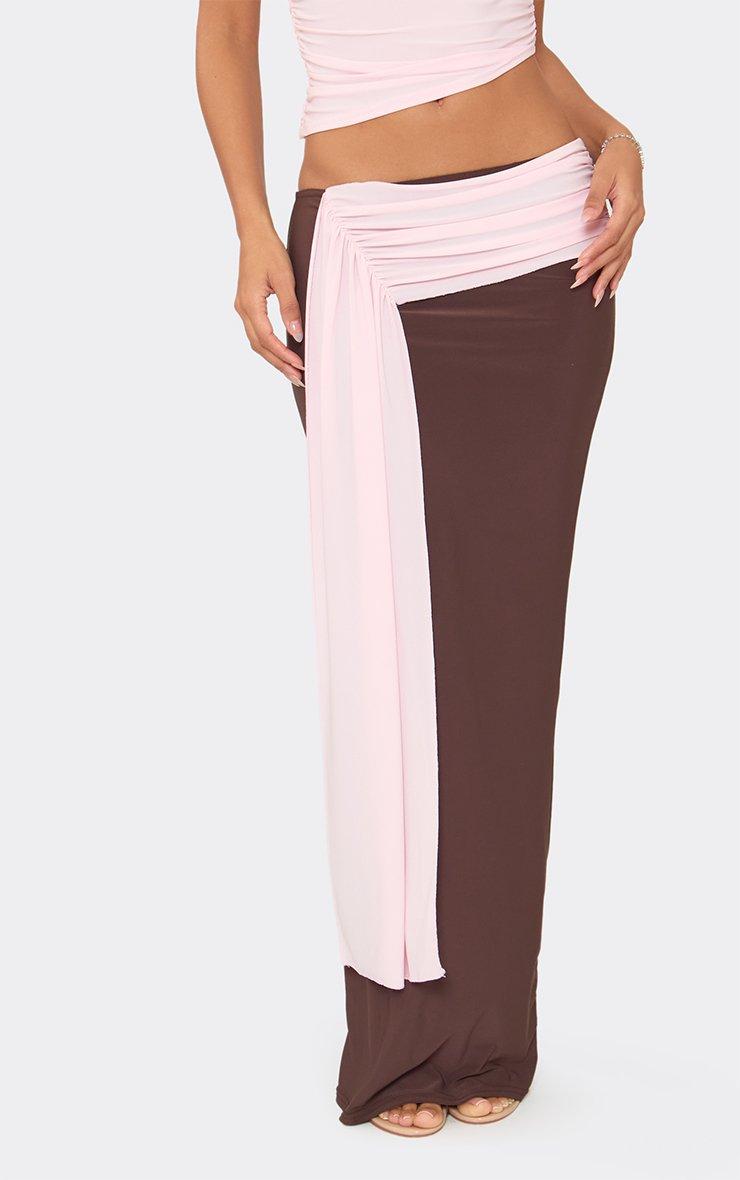 Low Rise Contrast Pink Drape Maxi Skirt In Chocolate Brown