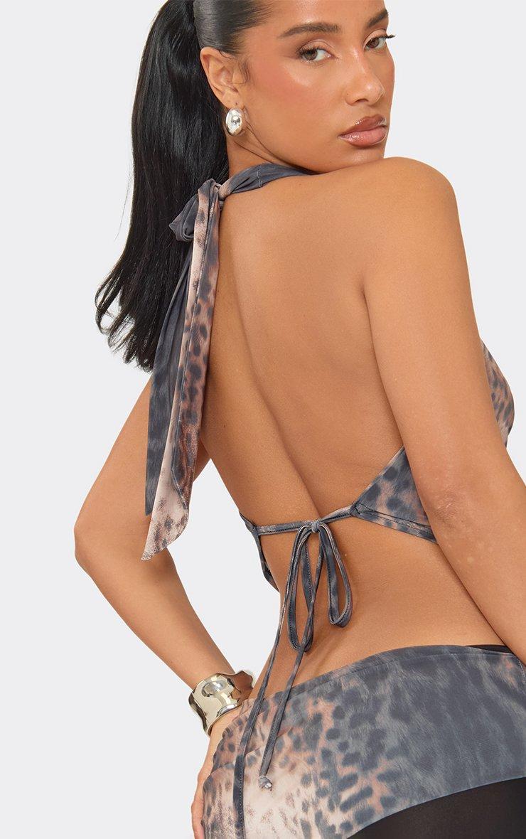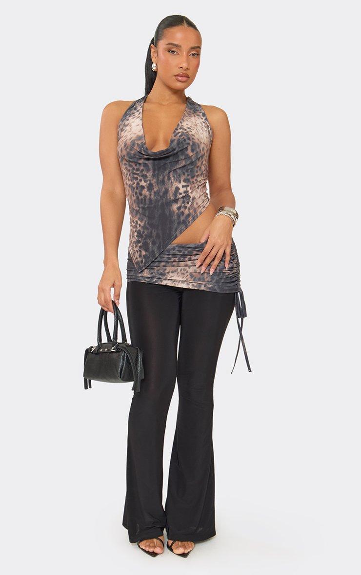 Cowl Halter Neck Asymmetric Hem Top In Brown Leopard Print