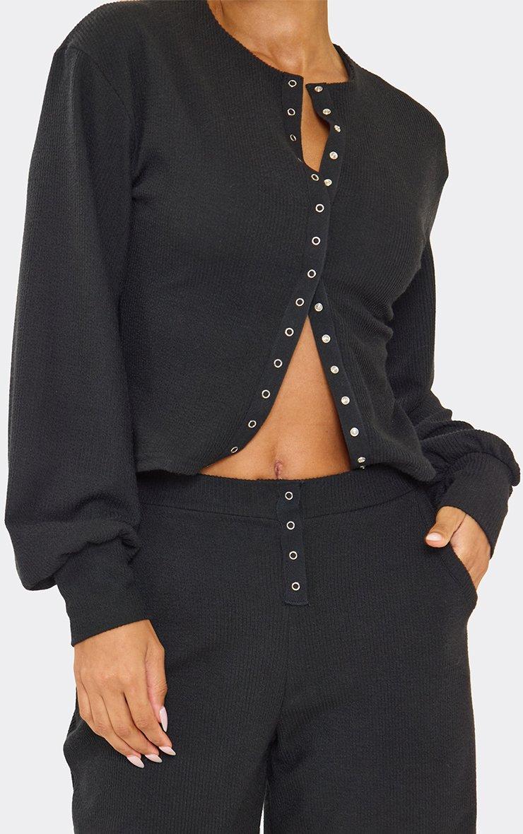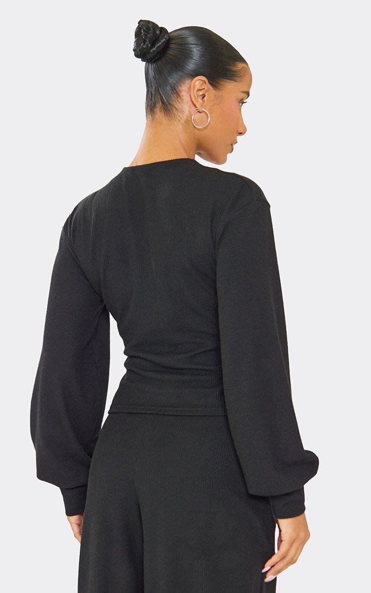 Balloon Sleeve Cinched Waist Popper Front Detail Top In Black Ribbed