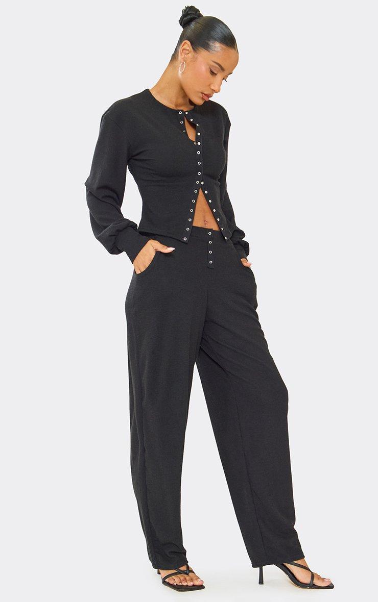 Mid Rise Popper Detail Trousers In Black Ribbed
