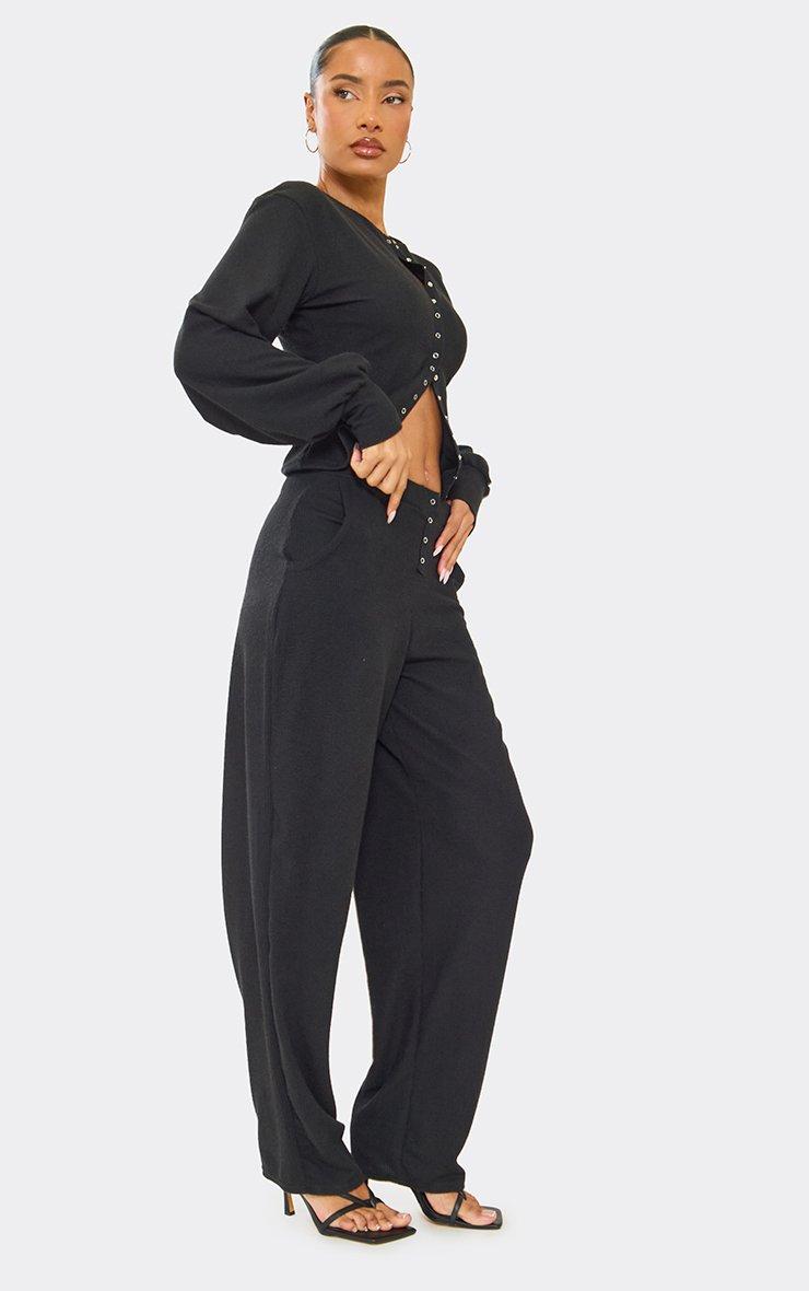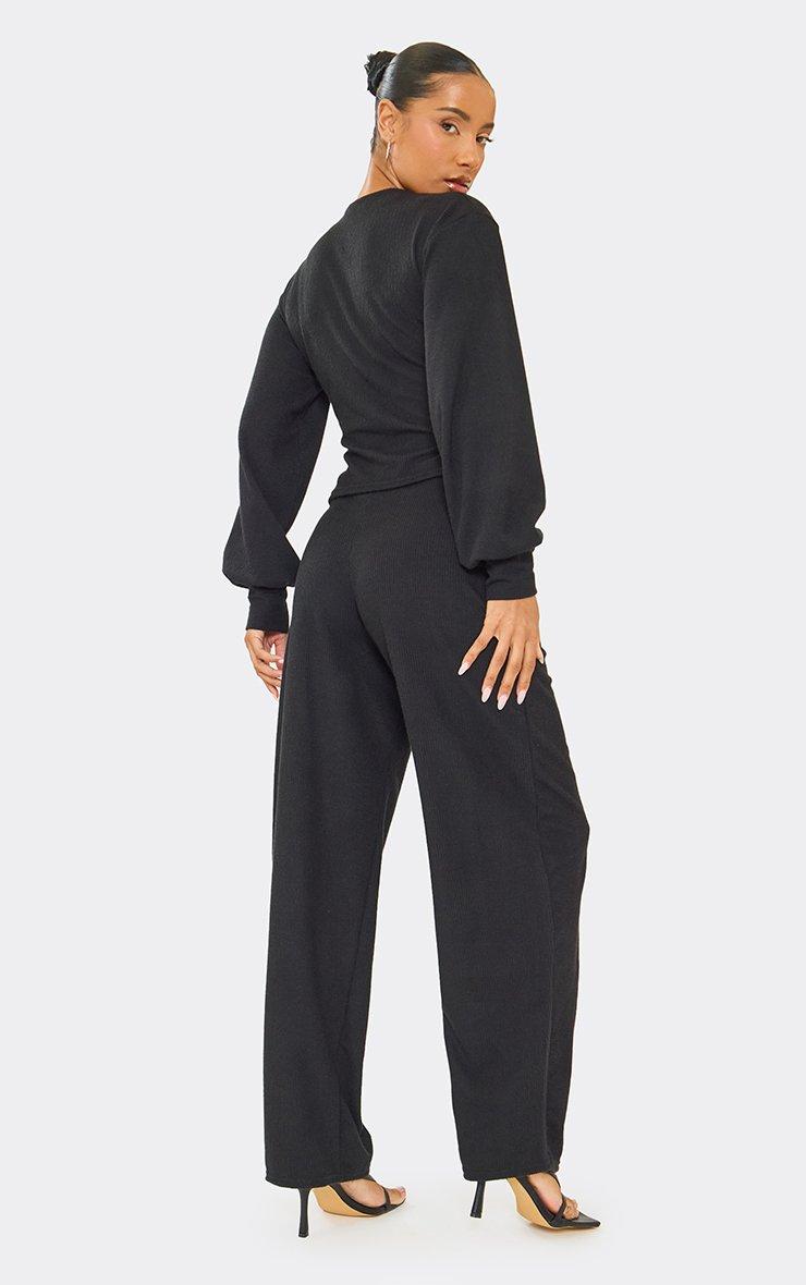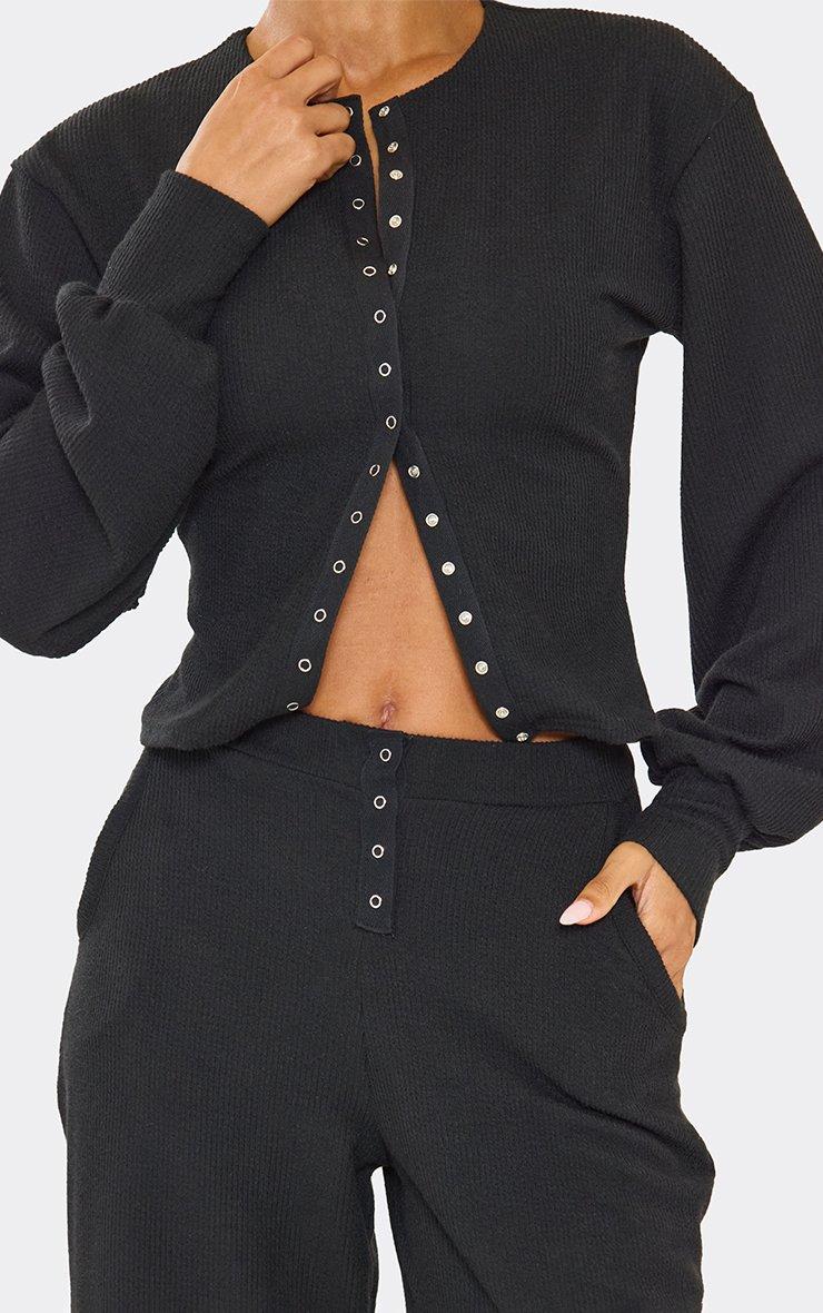 Balloon Sleeve Cinched Waist Popper Front Detail Top In Black Ribbed