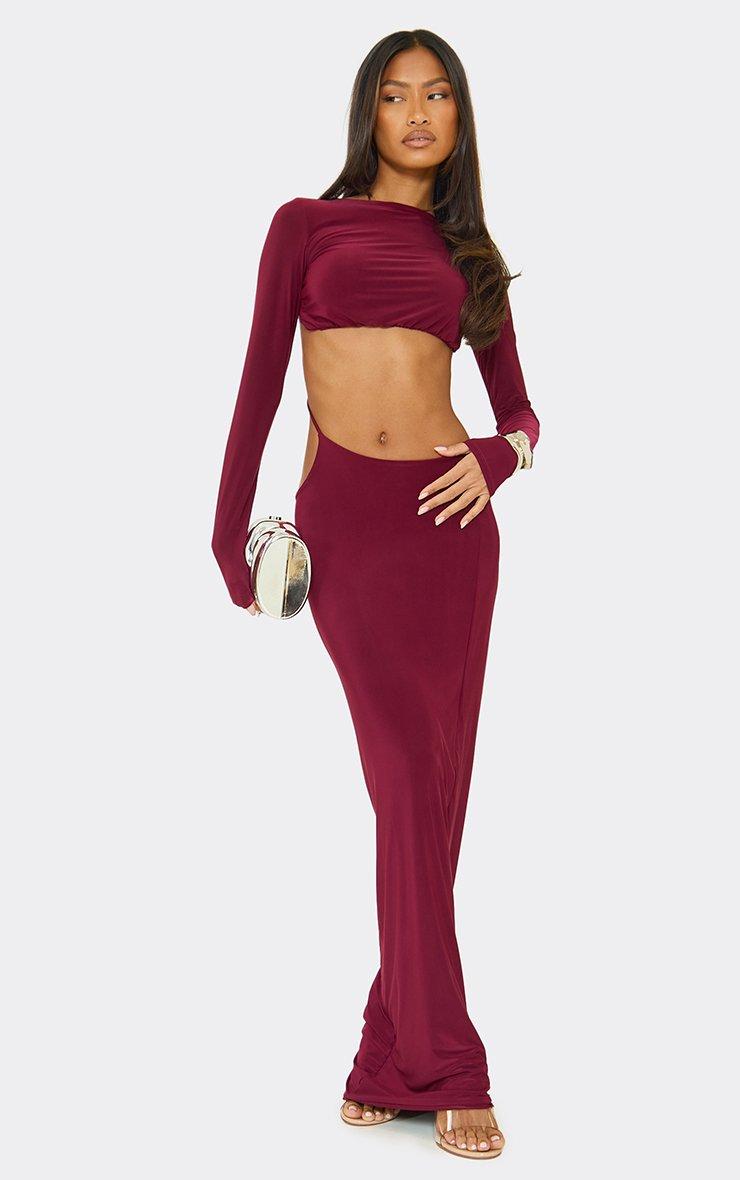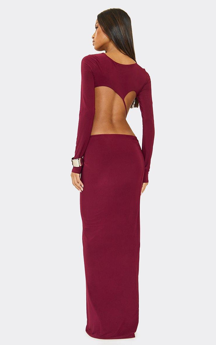 Long Sleeve Cut Out Strap Detail Maxi Dress In Burgundy Slinky