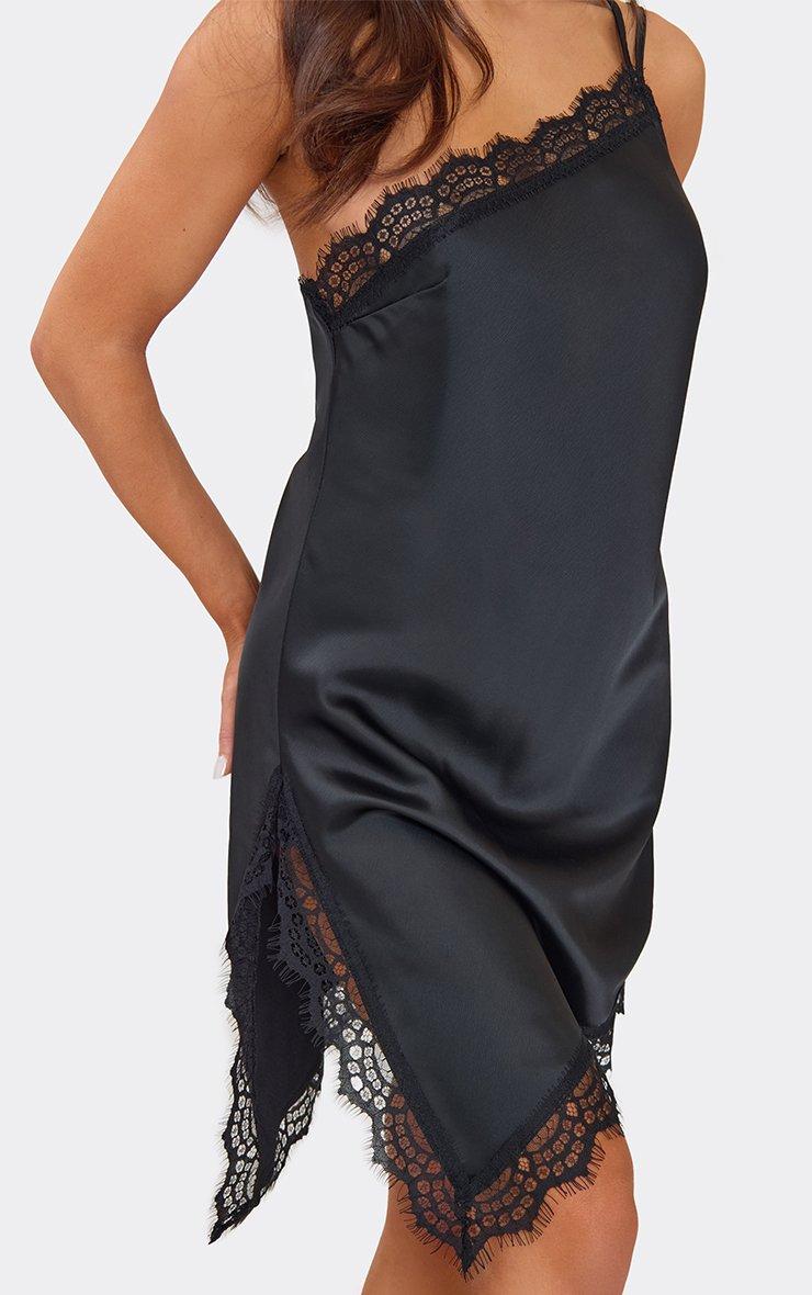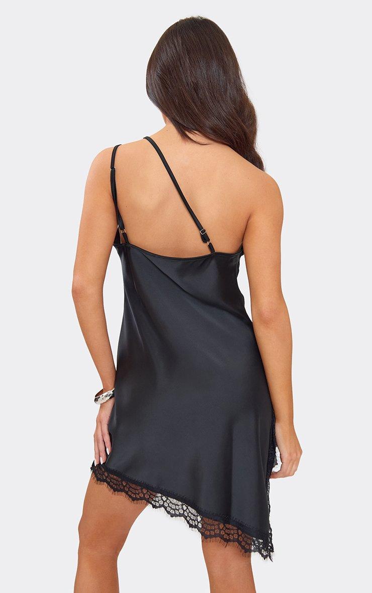 One Shoulder Double Strap Lace Trim Asymmetric Mini Dress In Black Satin