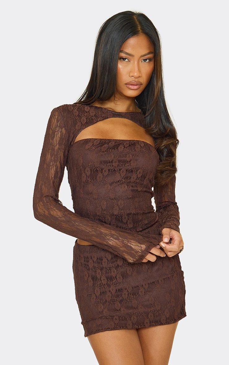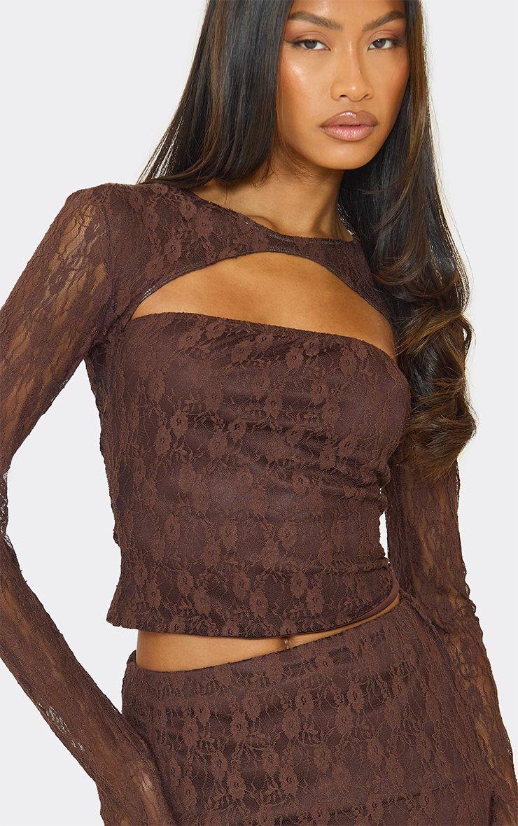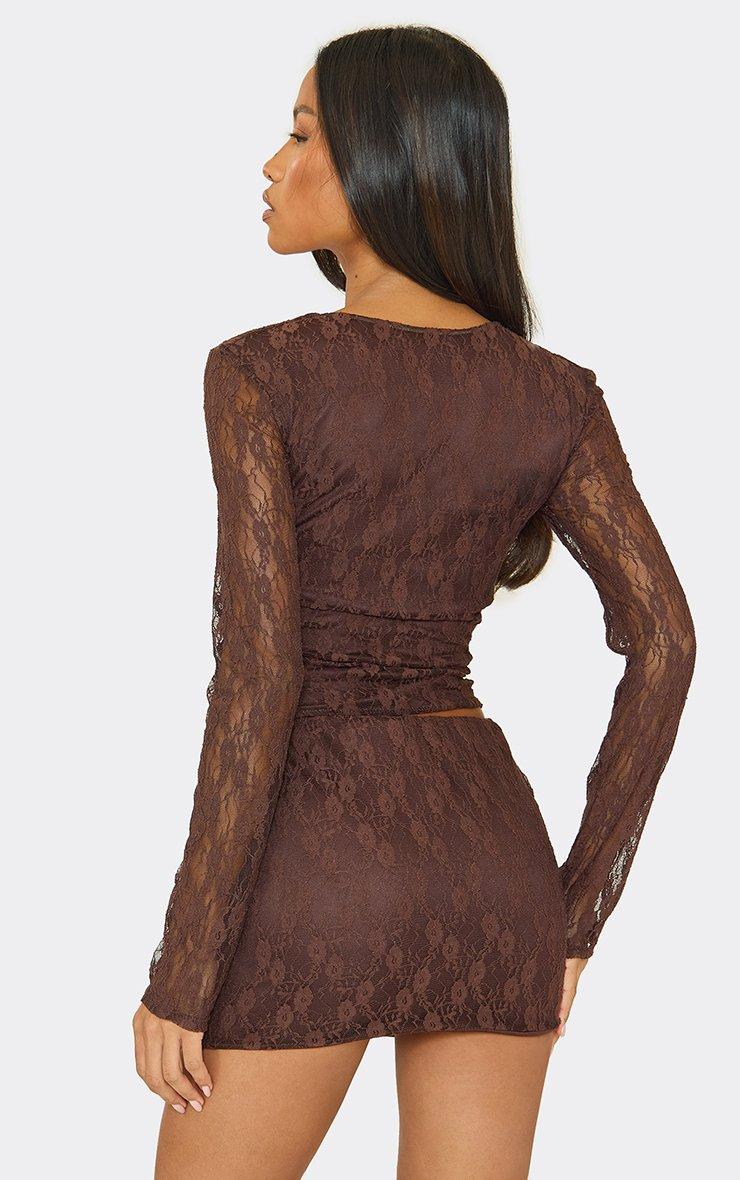 Long Sleeve Button Neck Top In Chocolate Brown Lace