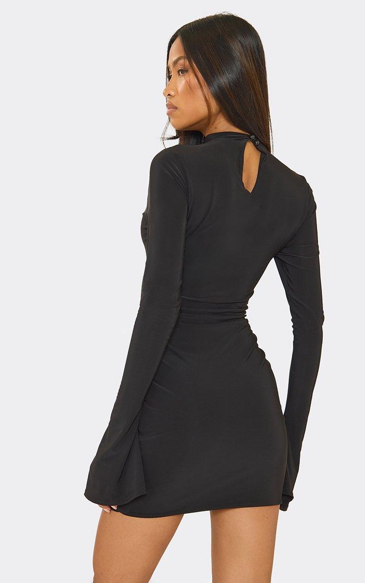 Flared Sleeve High Neck Mini Dress In Black Slinky