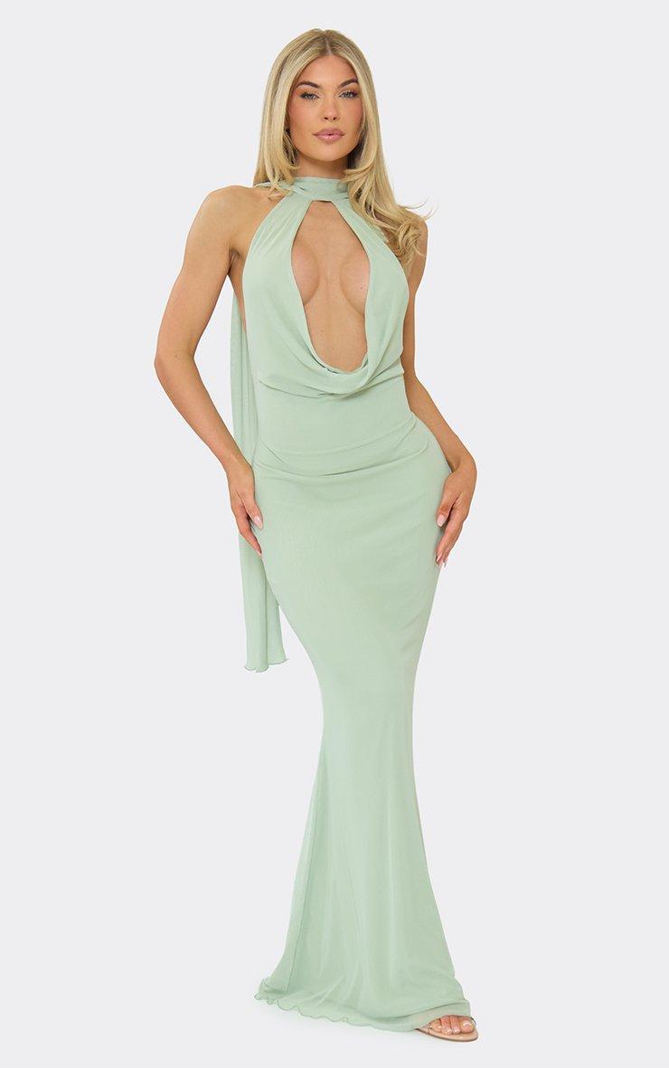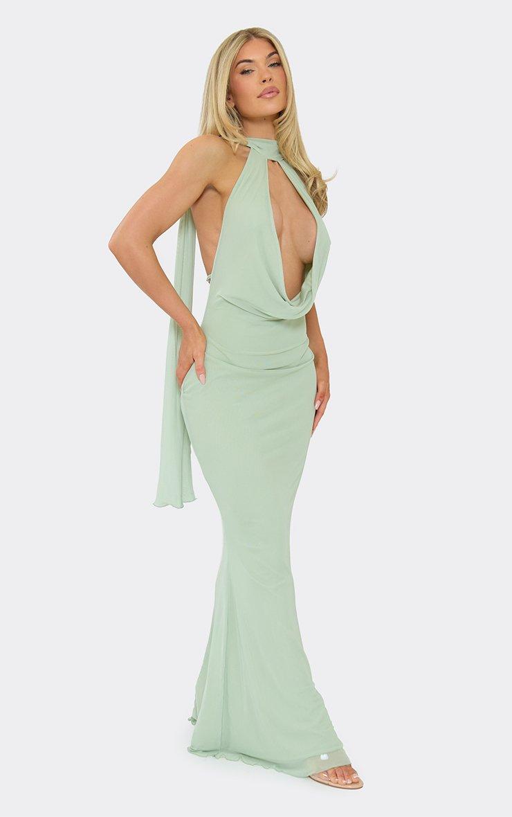 high cowl neck scarf detail fishtail maxi dress in sage green