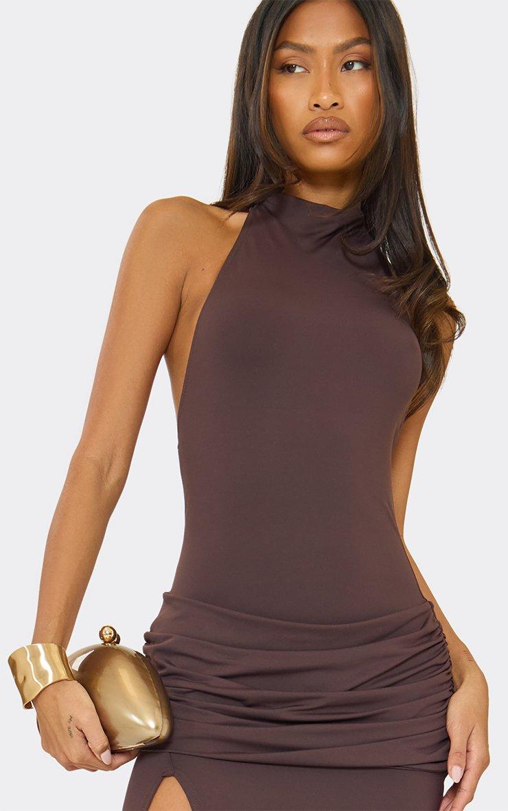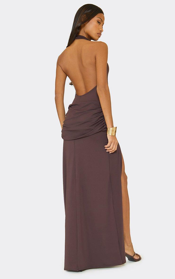 Racer Neck Draped Ruched Detail Maxi Dress In Chocolate Brown