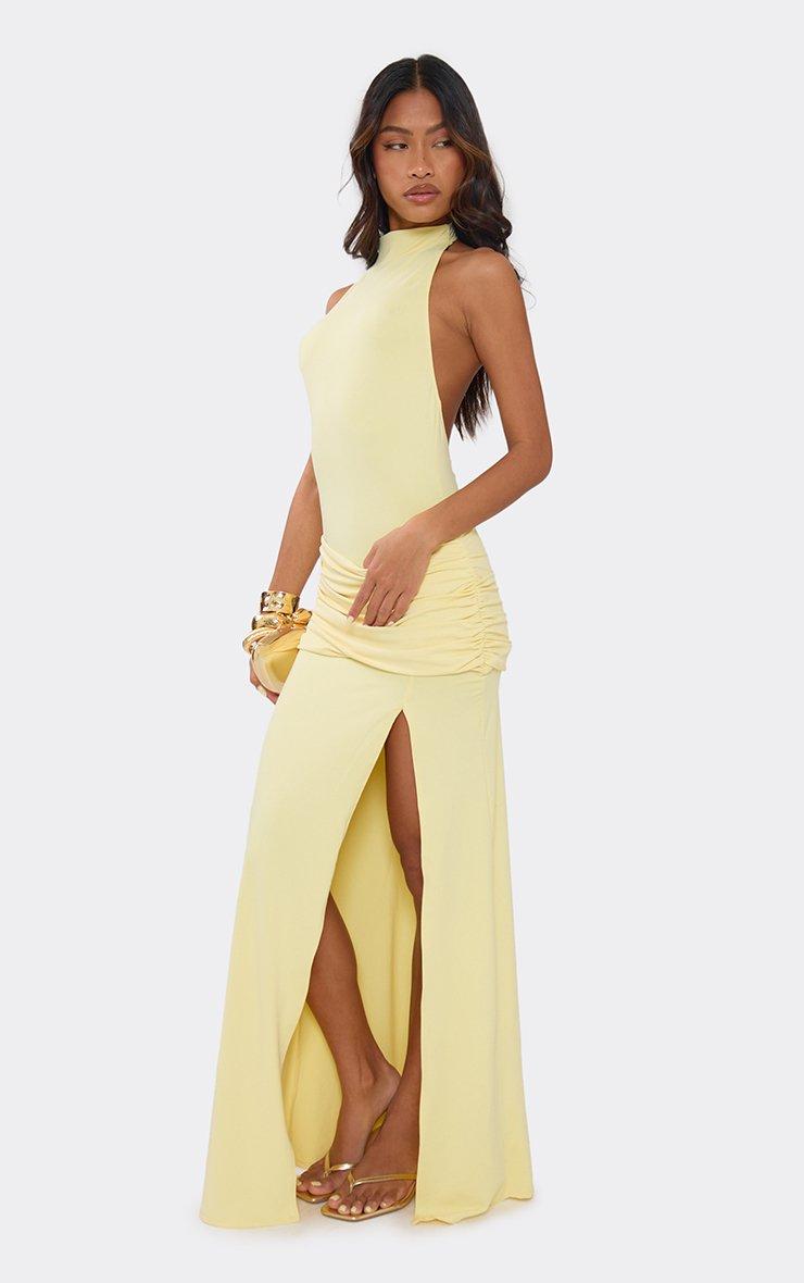 racer neck draped ruched detail maxi dress in yellow