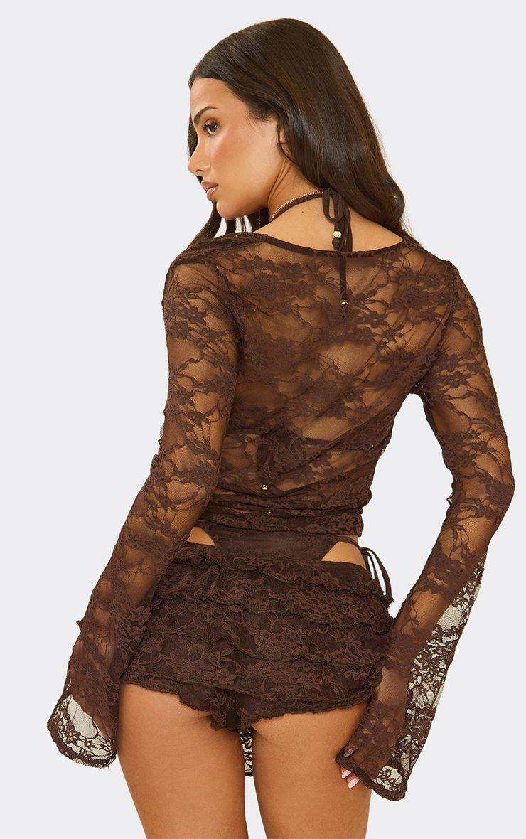Flared Sleeve Cowl Front Beach Top In Chocolate Brown Lace