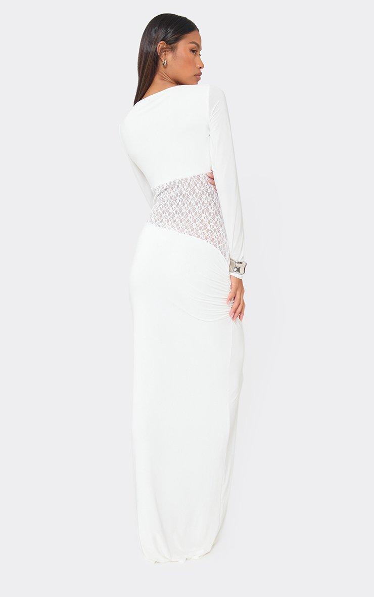 Long Sleeve Contrast Lace Detail Maxi Dress In White Slinky