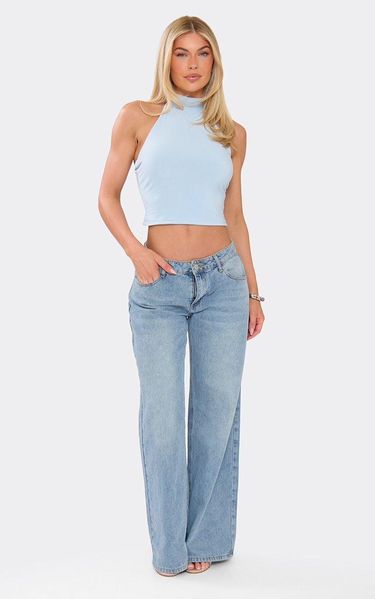 Halter Neck Open Back Cropped Top In Blue Slinky