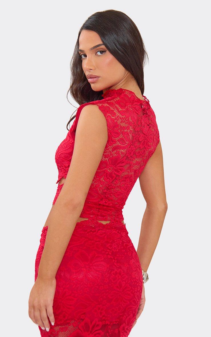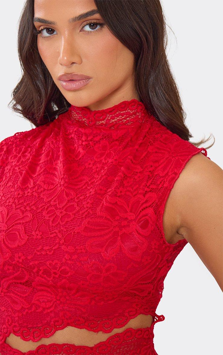 High Neck Cut Out Detail Top In Red Lace