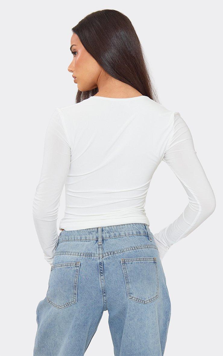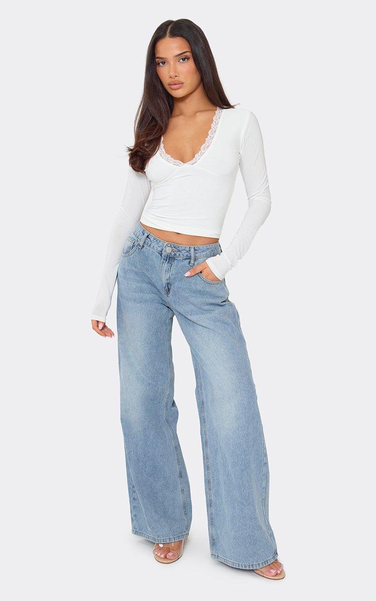 Long Sleeve Plunge Lace Trim Top In White