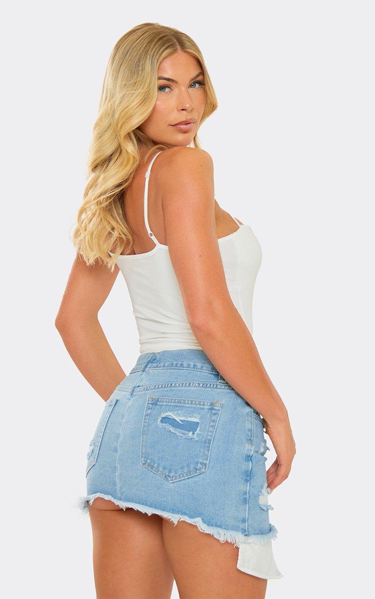 Low Rise Distressed Hem Detail Mini Skirt In Washed Blue Denim