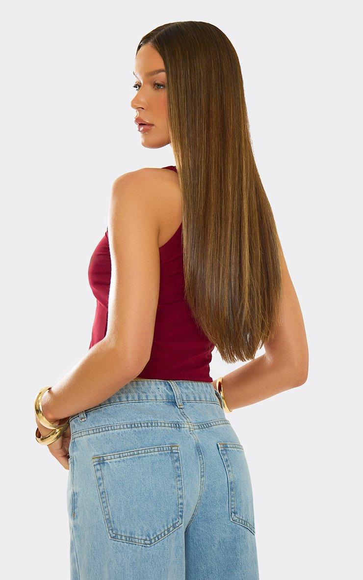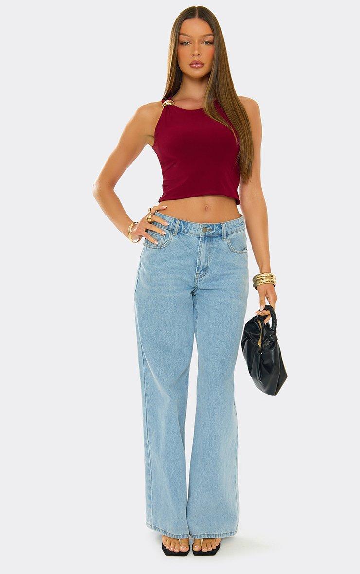 Sleeveless Trim Strap Detail Crop Top In Burgundy Slinky