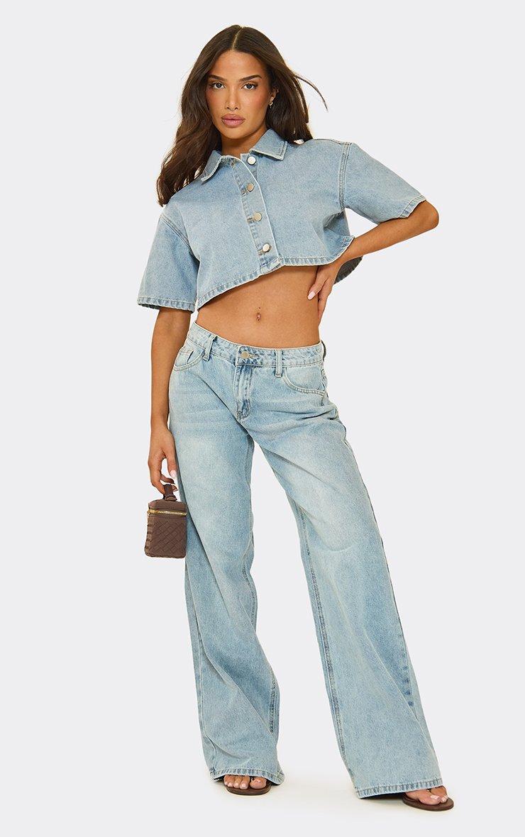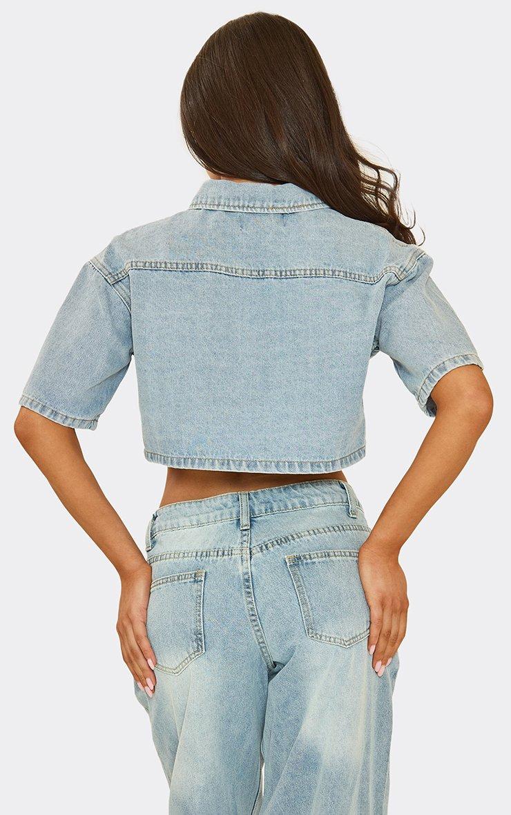 Short Sleeve Button Front Crop Top In Light Blue Denim