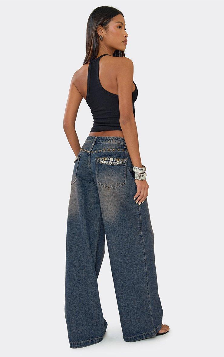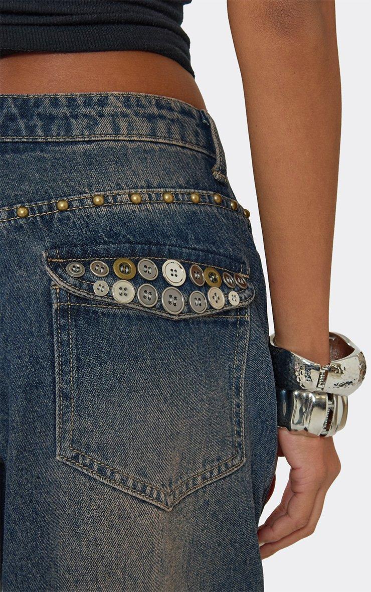 Low Rise Button Detail Boyfriend Jeans In Vintage Blue Denim