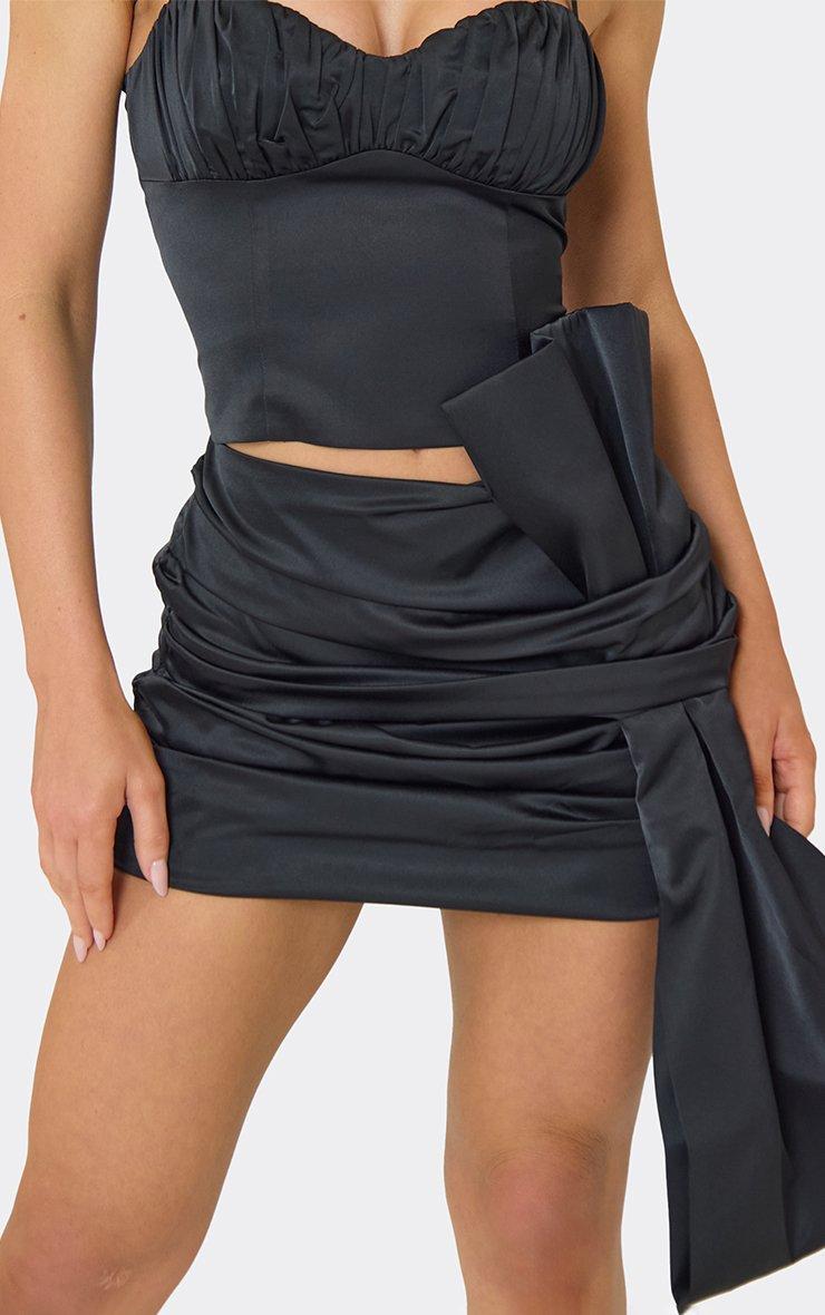 Mid Rise Ruched Oversized Bow Detail Mini Skirt In Black Satin
