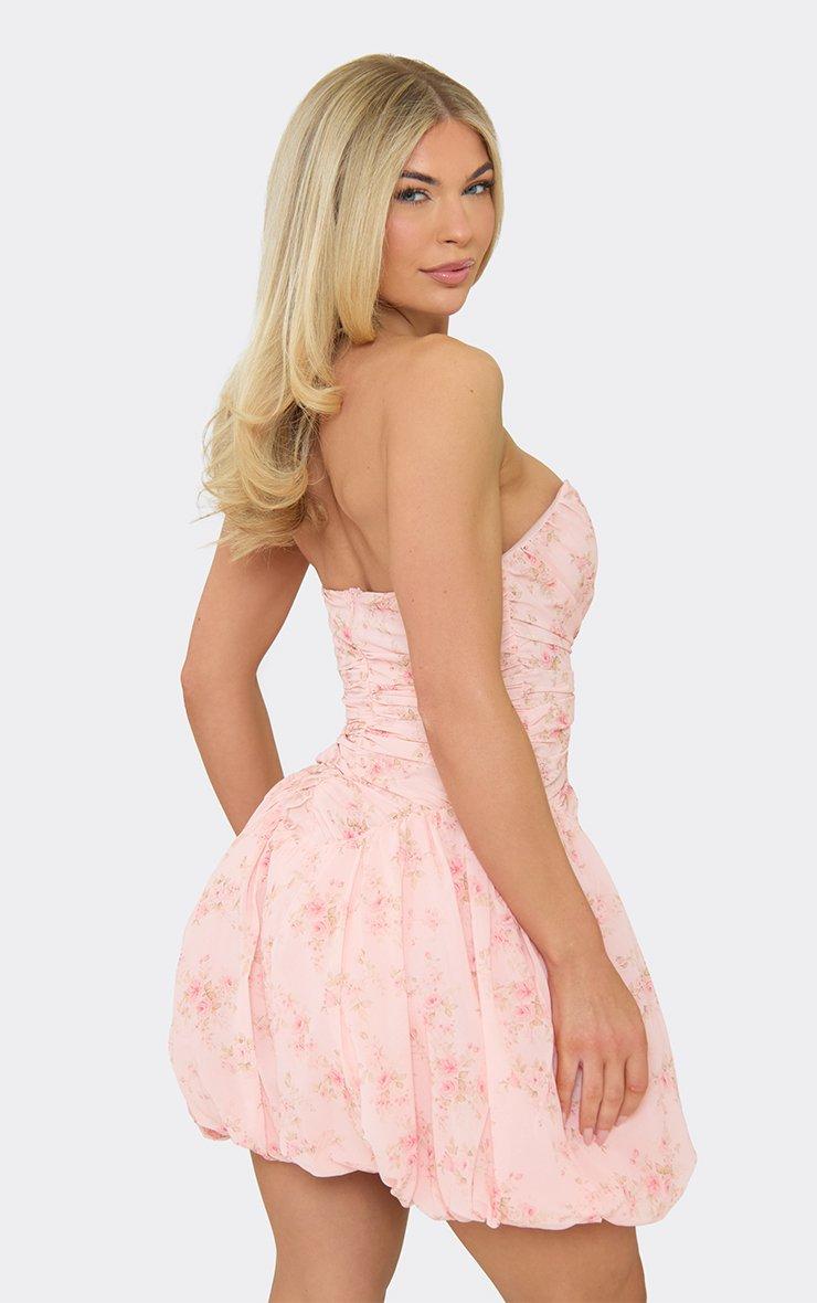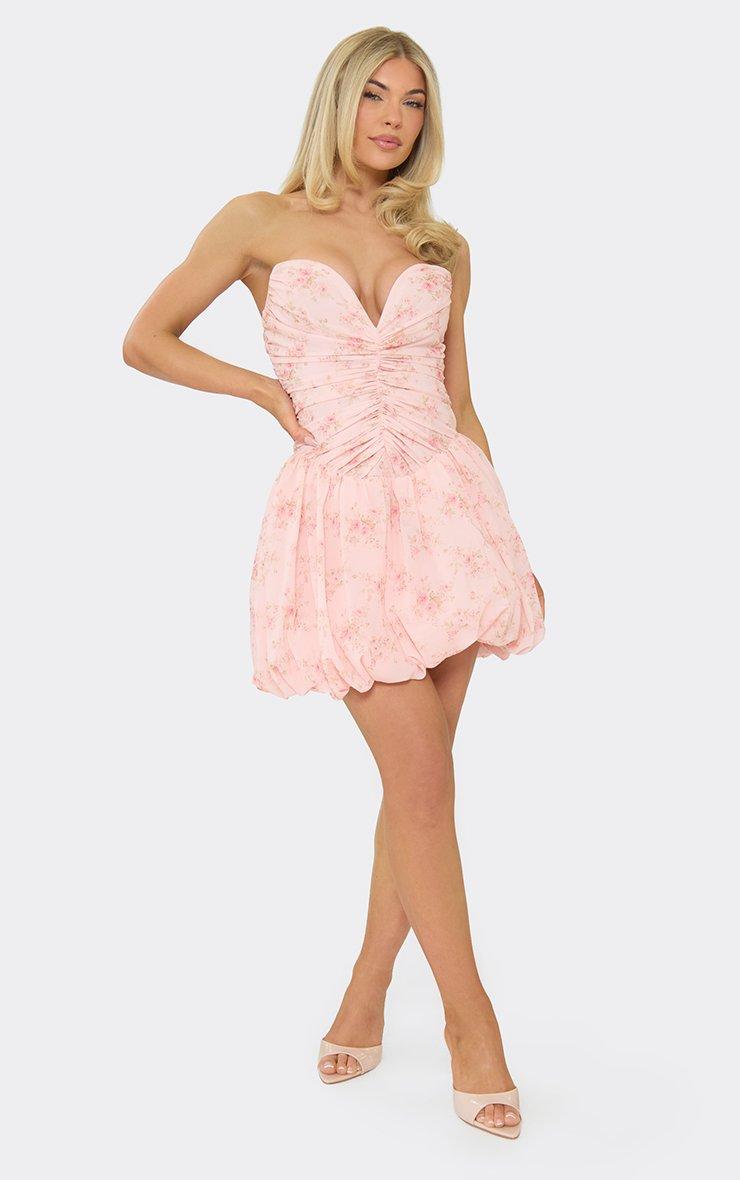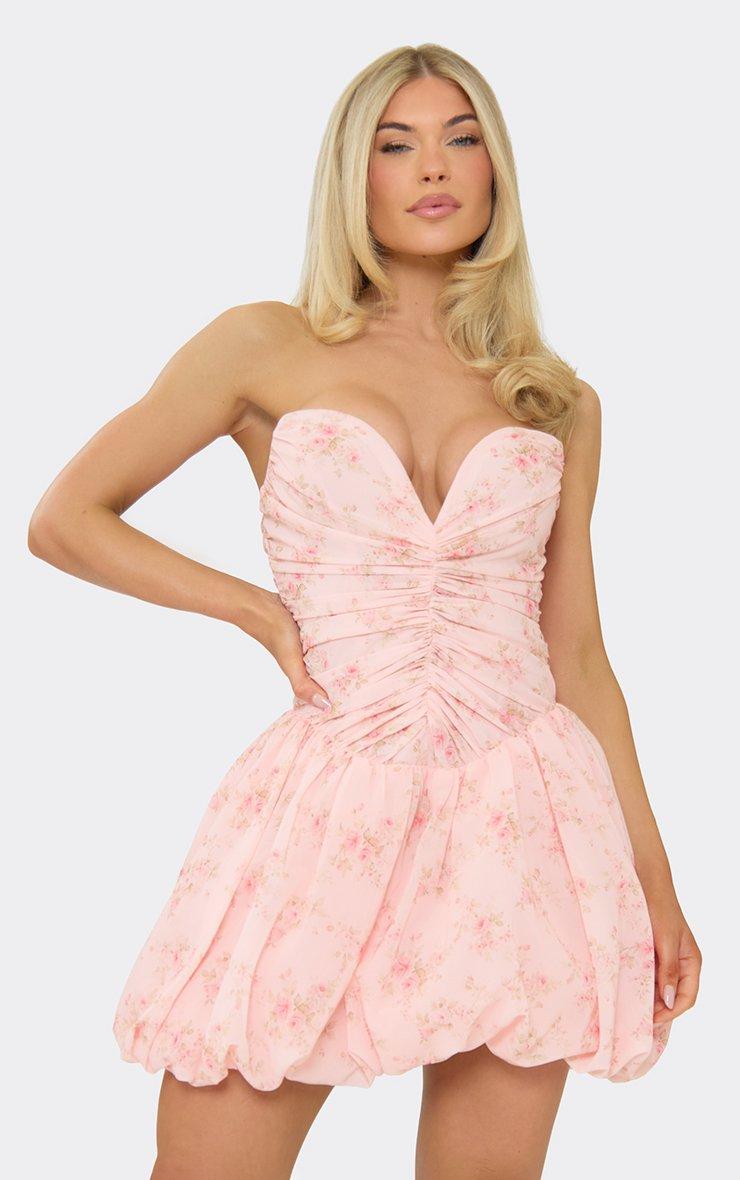 bandeau plunge puffball hem detail mini dress in pink ditsy floral print