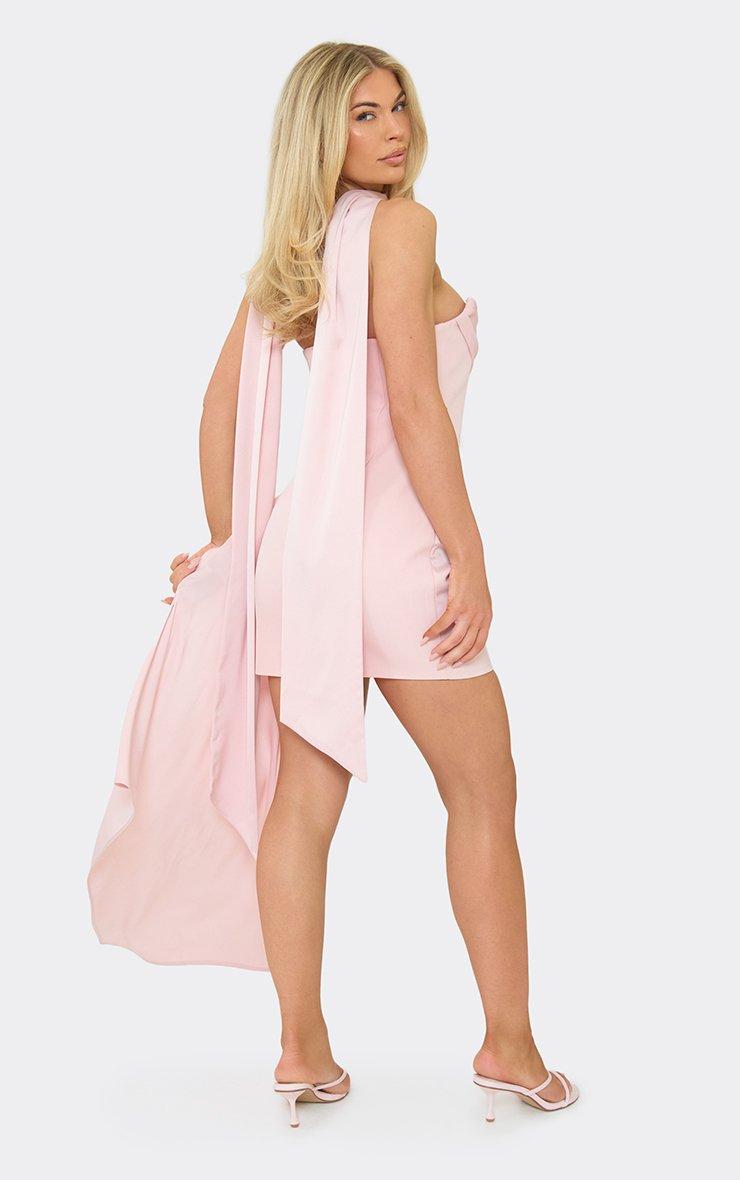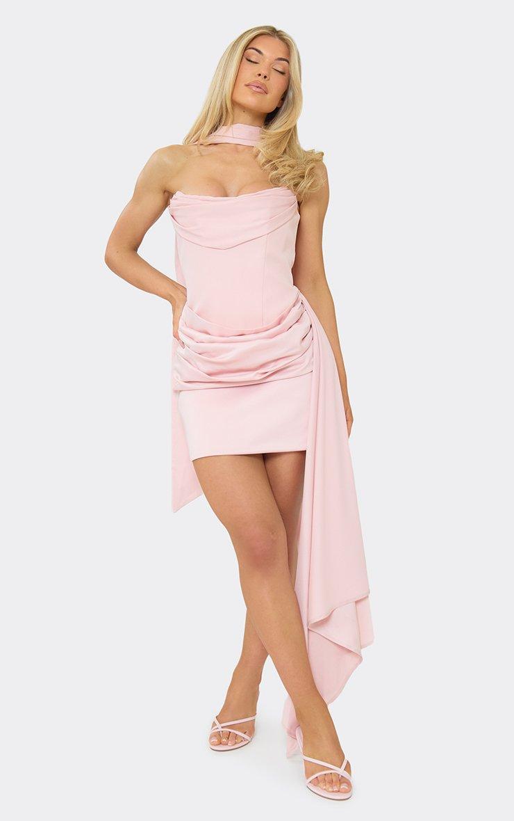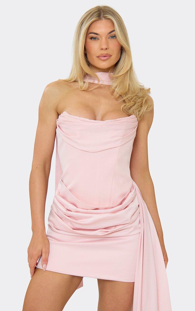 bandeau corset ruched panel scarf detail mini dress in pink satin