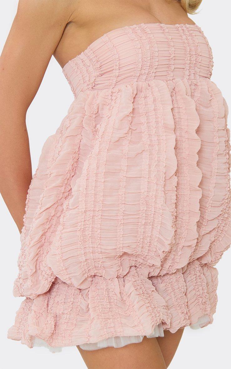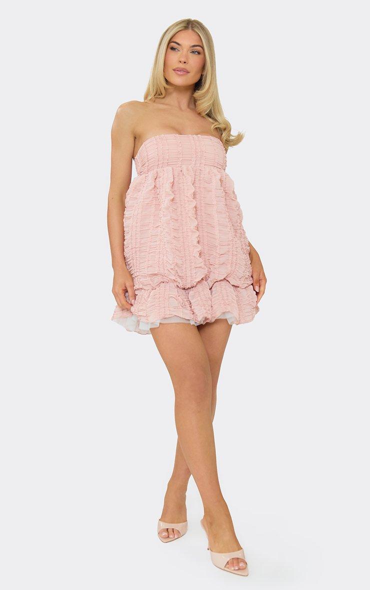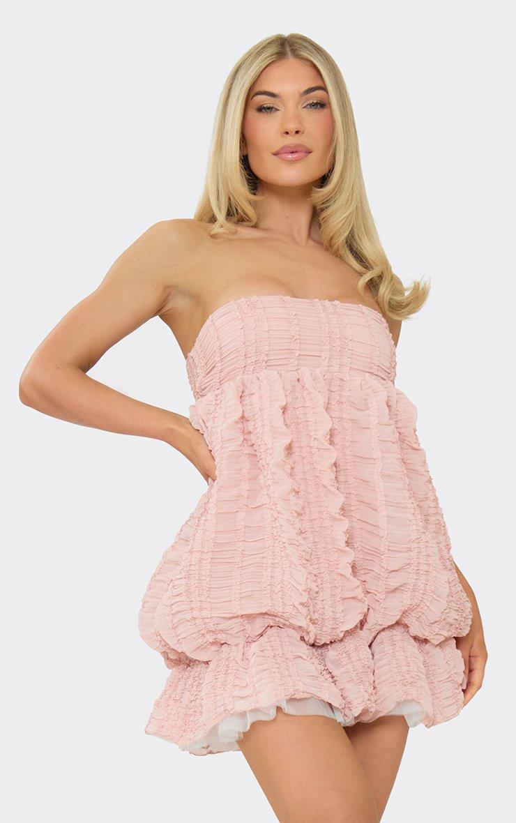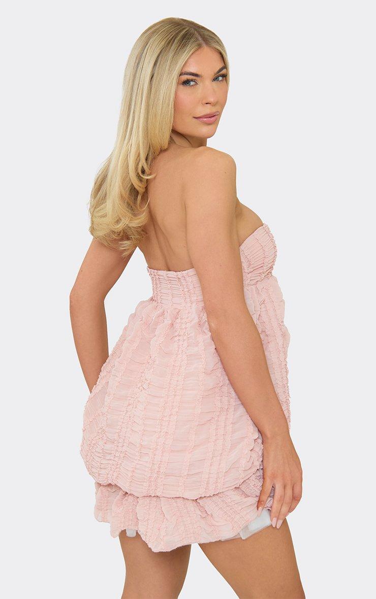 Bandeau Puffball Ruffle Detail Mini Dress In Pink Textured