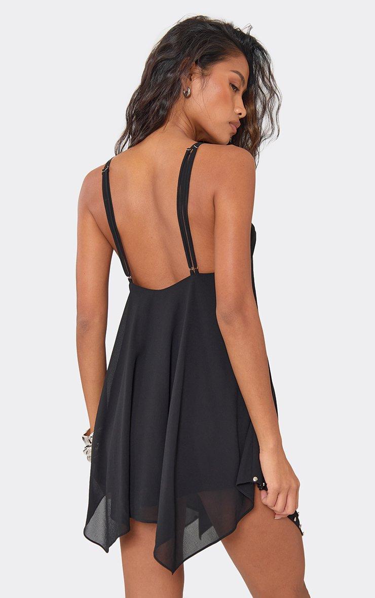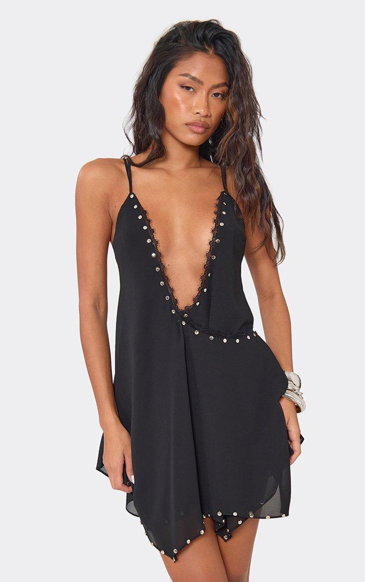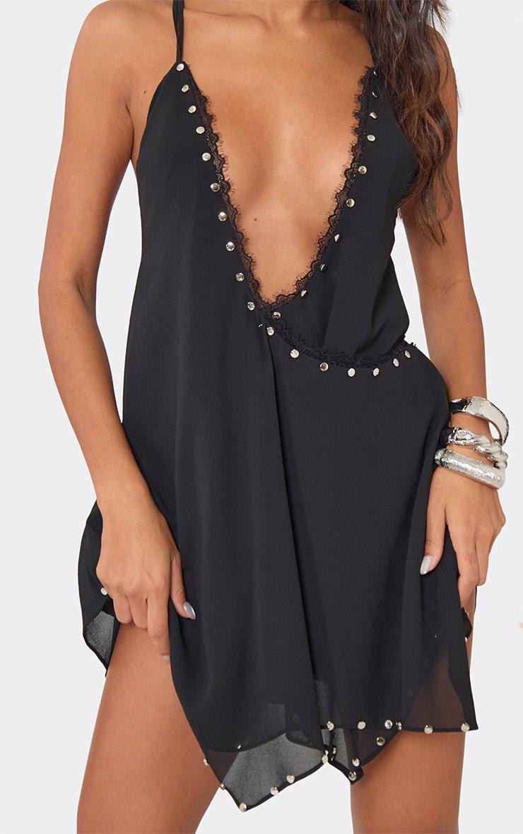 Double Strap Lace Trim Plunge Front Studded Mini Dress In Black