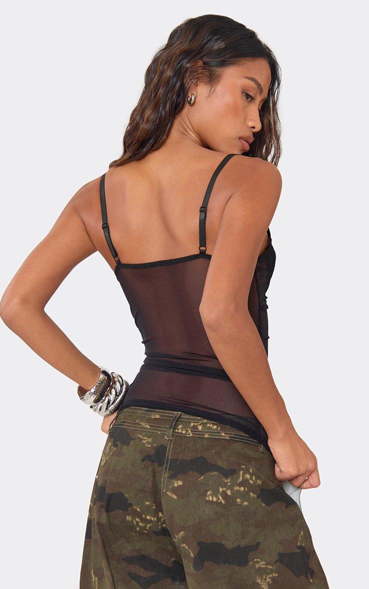 Strappy Mesh Panel Detail Corset Top In Black Lace
