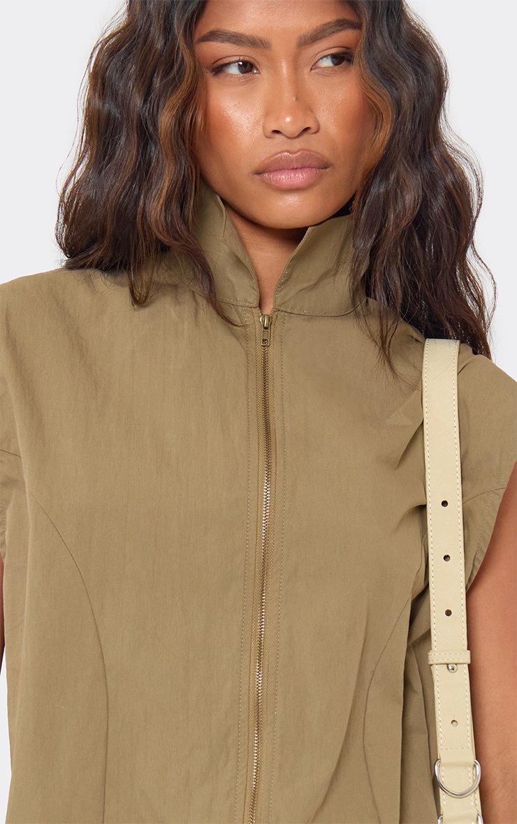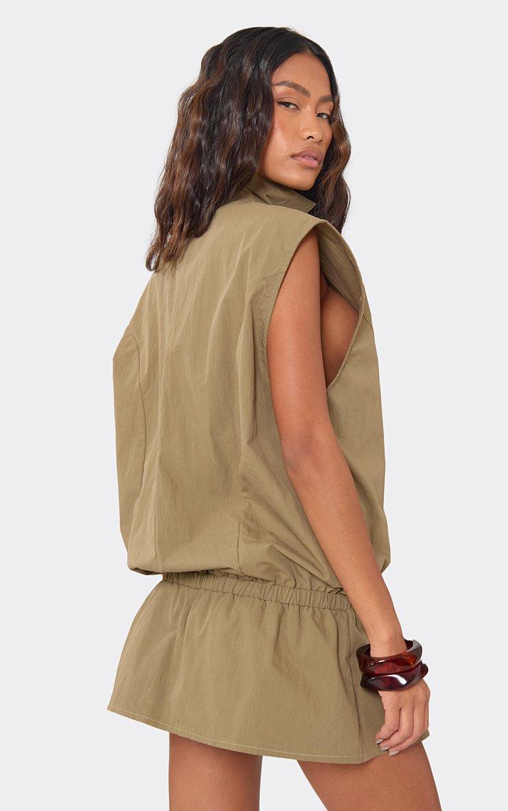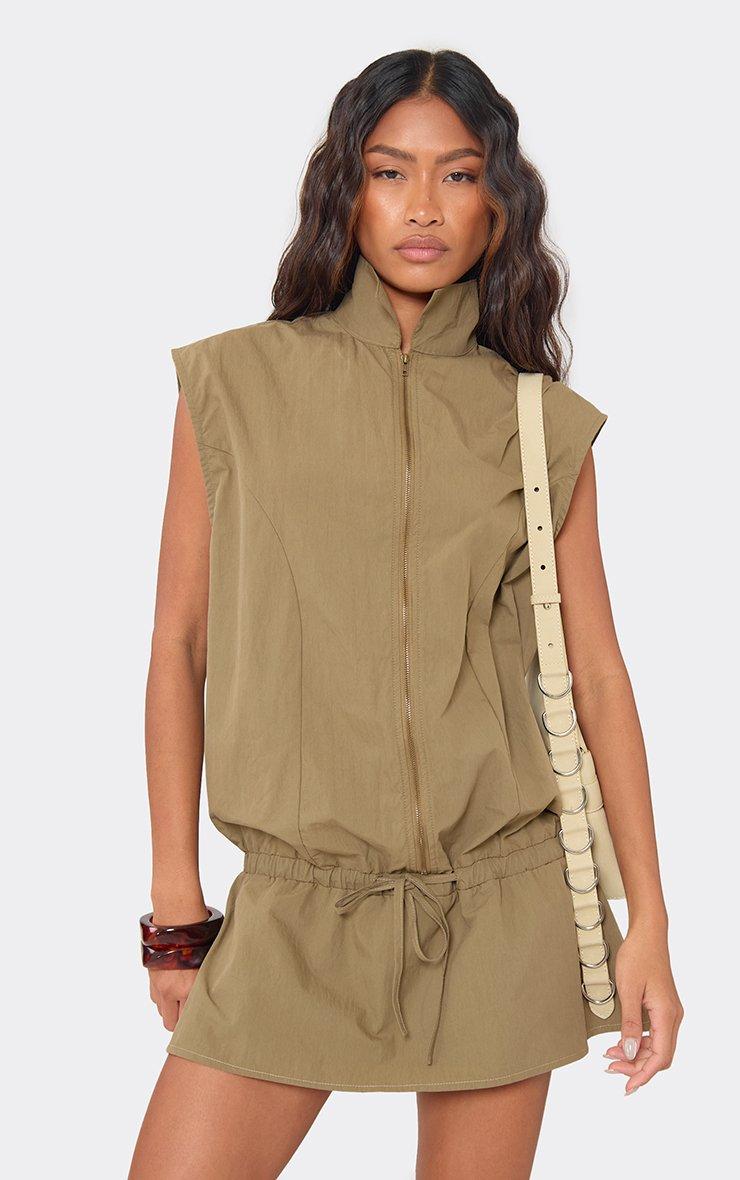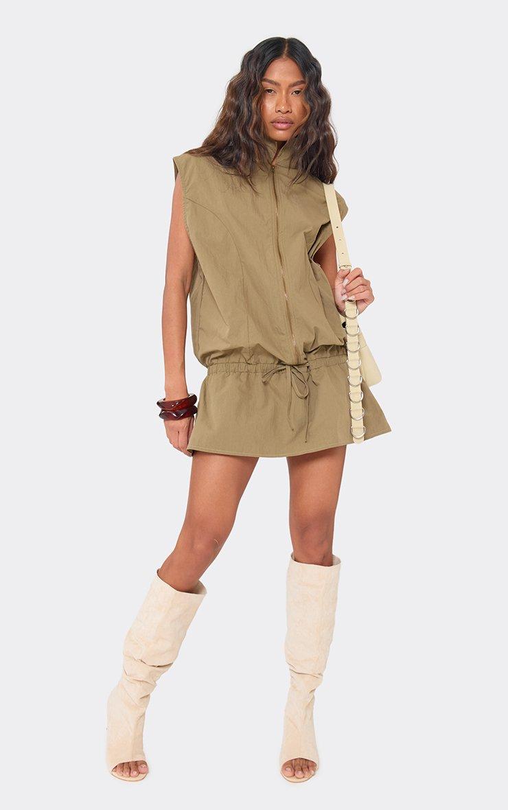 sleeveless zip front tie waist mini cargo dress in khaki green