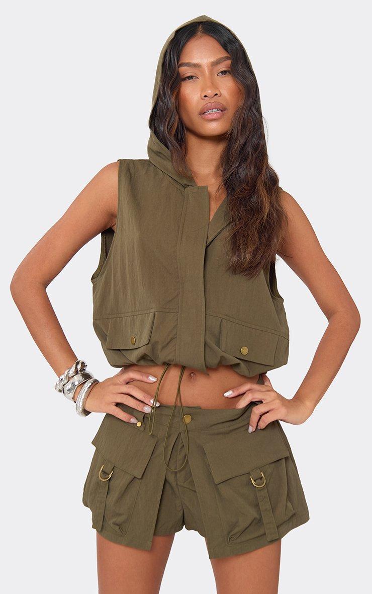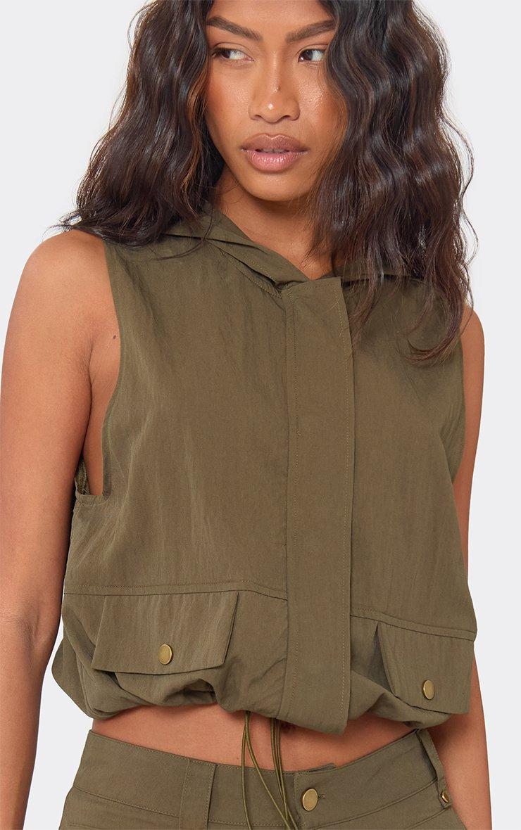 Sleeveless Popper Front Hooded Cargo Top In Khaki Green