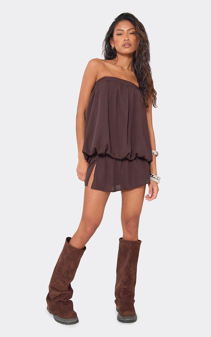 bandeau blouson split front mini dress in chocolate brown