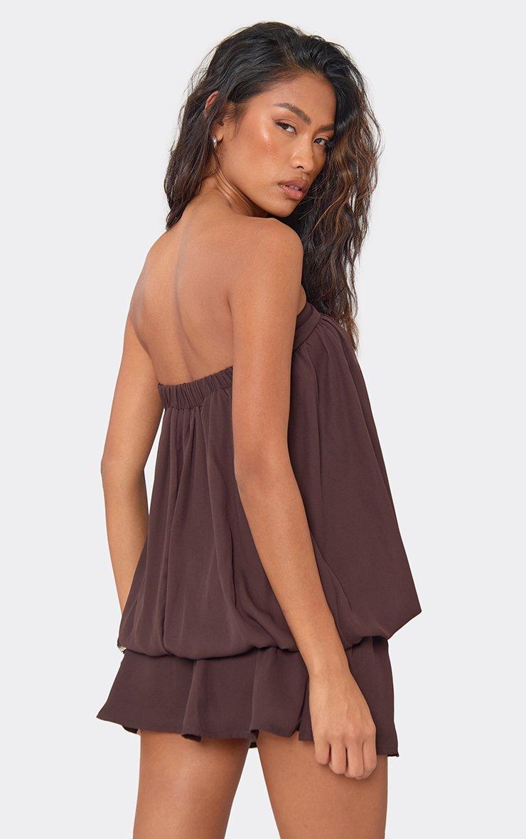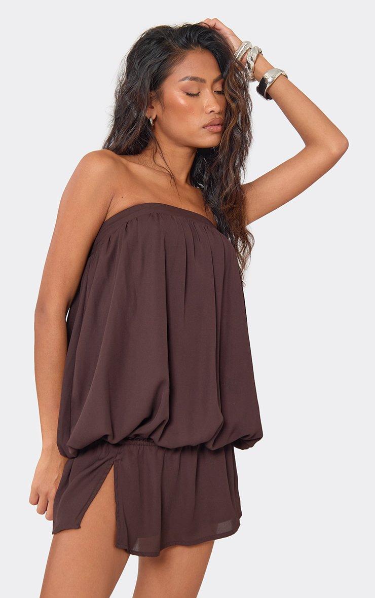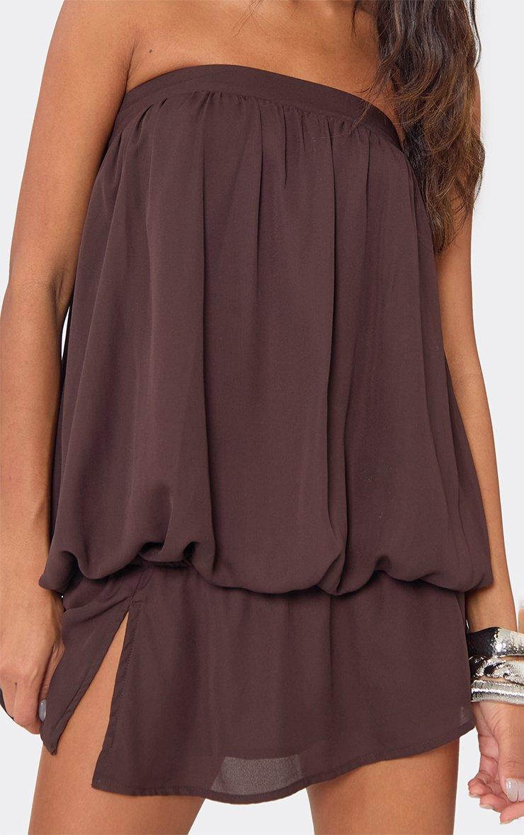 Bandeau Blouson Split Front Mini Dress In Chocolate Brown