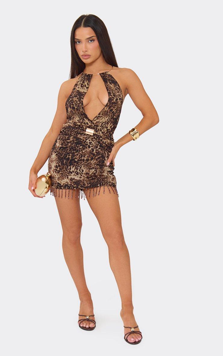 Plunge Front Trim Detail Beaded Tassel Hem Mini Dress In Brown Leopard Print