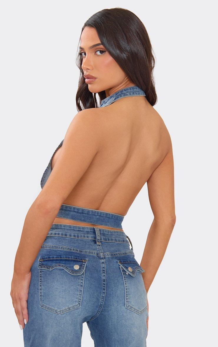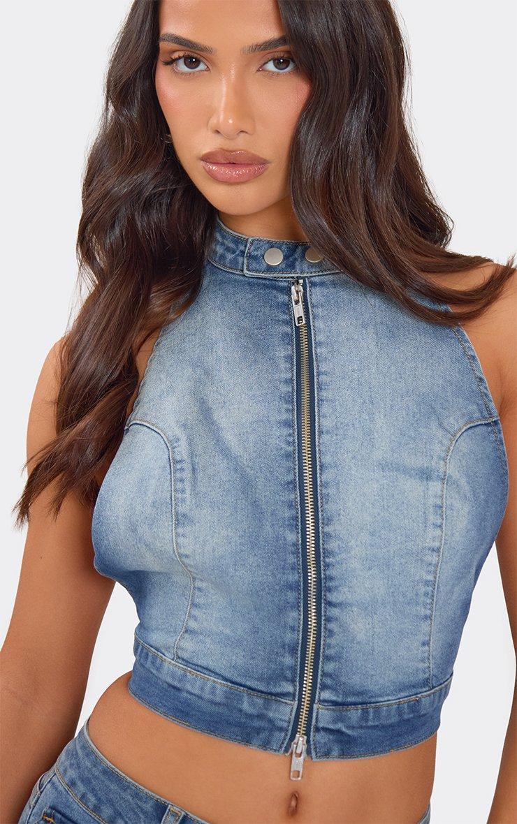 High Neck Sleeveless Zip Down Fitted Crop Top In Blue Wash Denim
