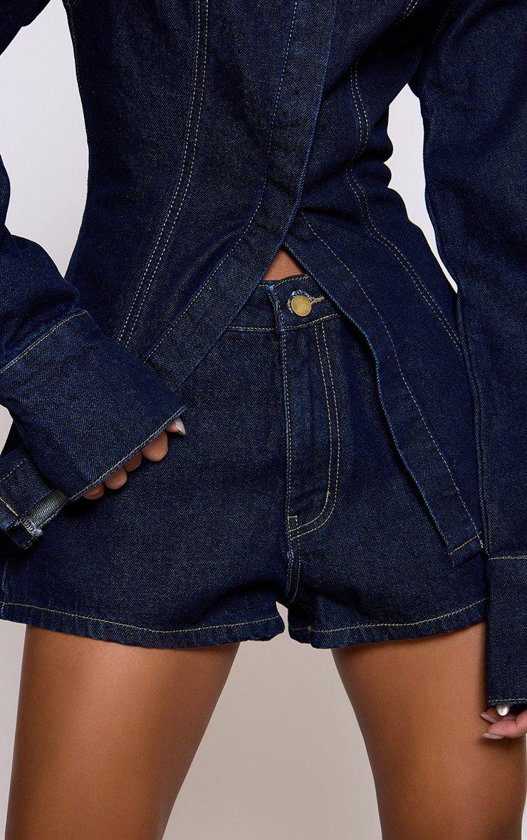 mid rise curved hem shorts in indigo blue denim