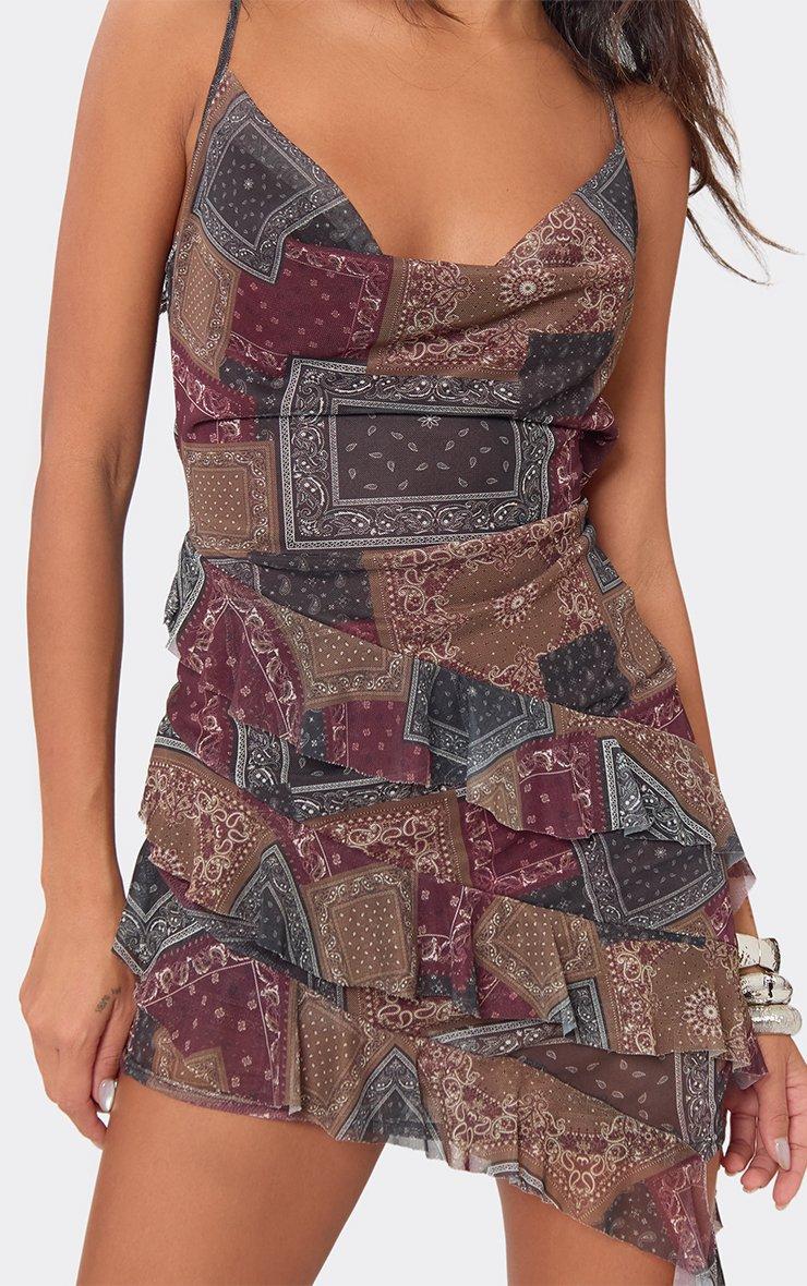 cowl neck asymmetric drape frill mini dress in brown paisley print mesh