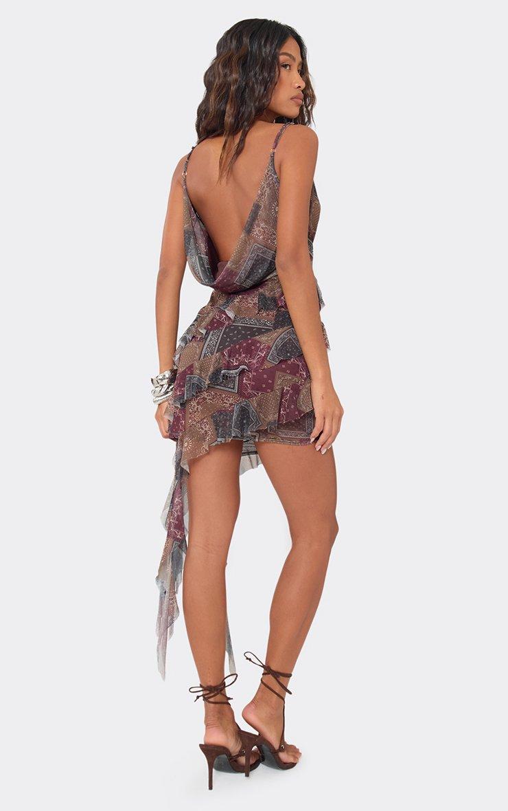 Cowl Neck Asymmetric Drape Frill Mini Dress In Brown Paisley Print Mesh