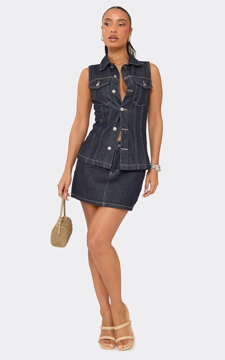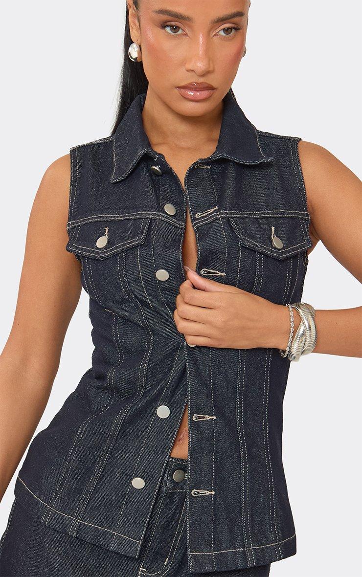 Sleeveless Button Front Longline Top In Dark Indigo Denim